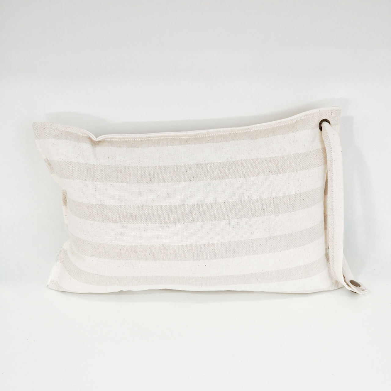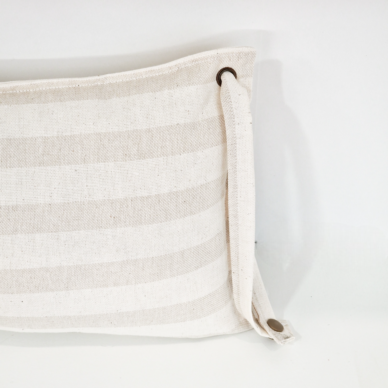 Almofada para utilizar na praia, feita com tecido impermeável e com fita adaptada com botão.