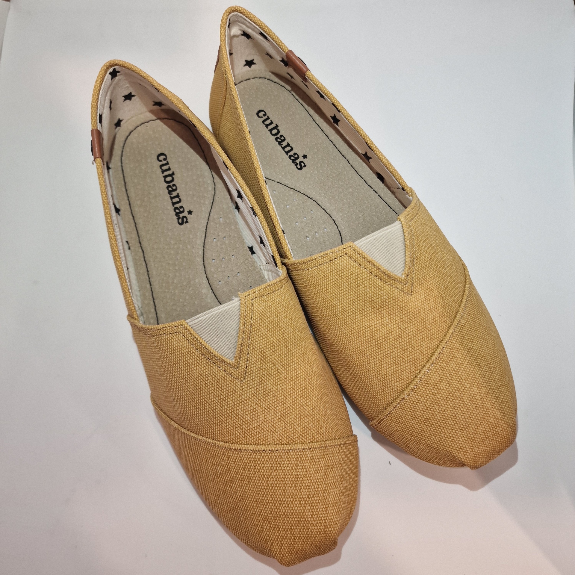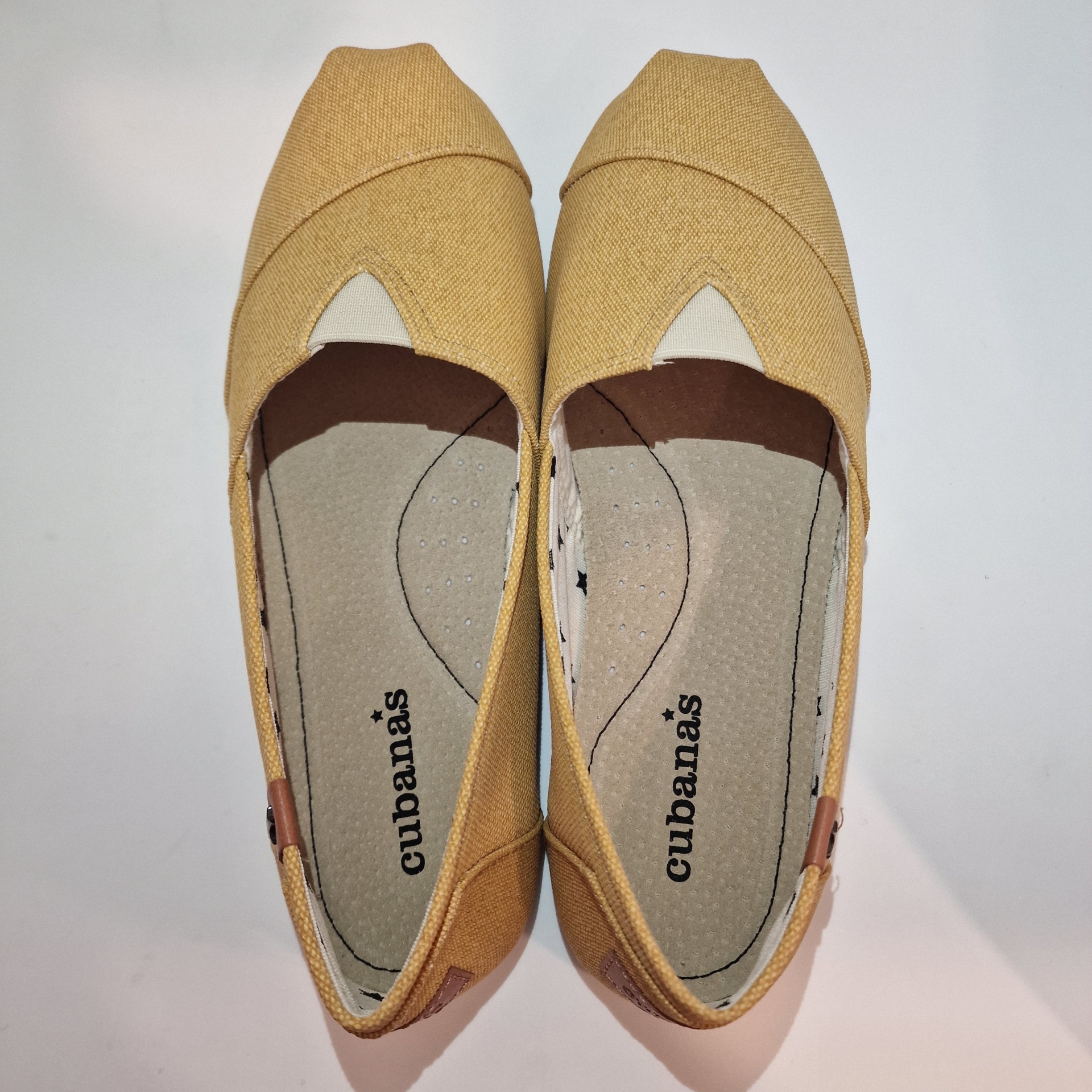 • Par de sapatilhas amarelas femininas de tecido com interior estampado e marca cubanas