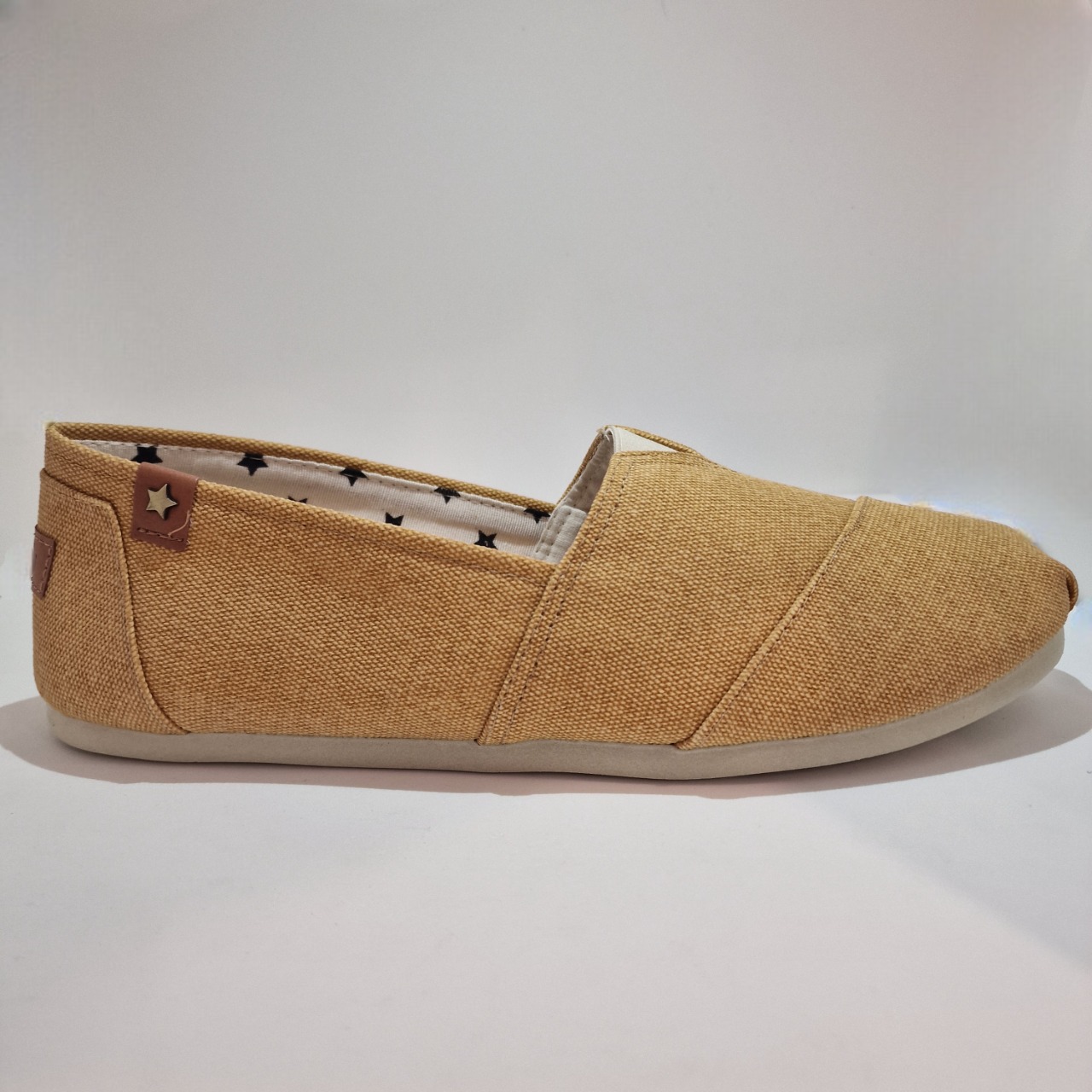 • Ténis casual castanho claro em lona com sola bege, etiqueta e detalhe de estrela metálica, interior com padrão de estrelas pretas.