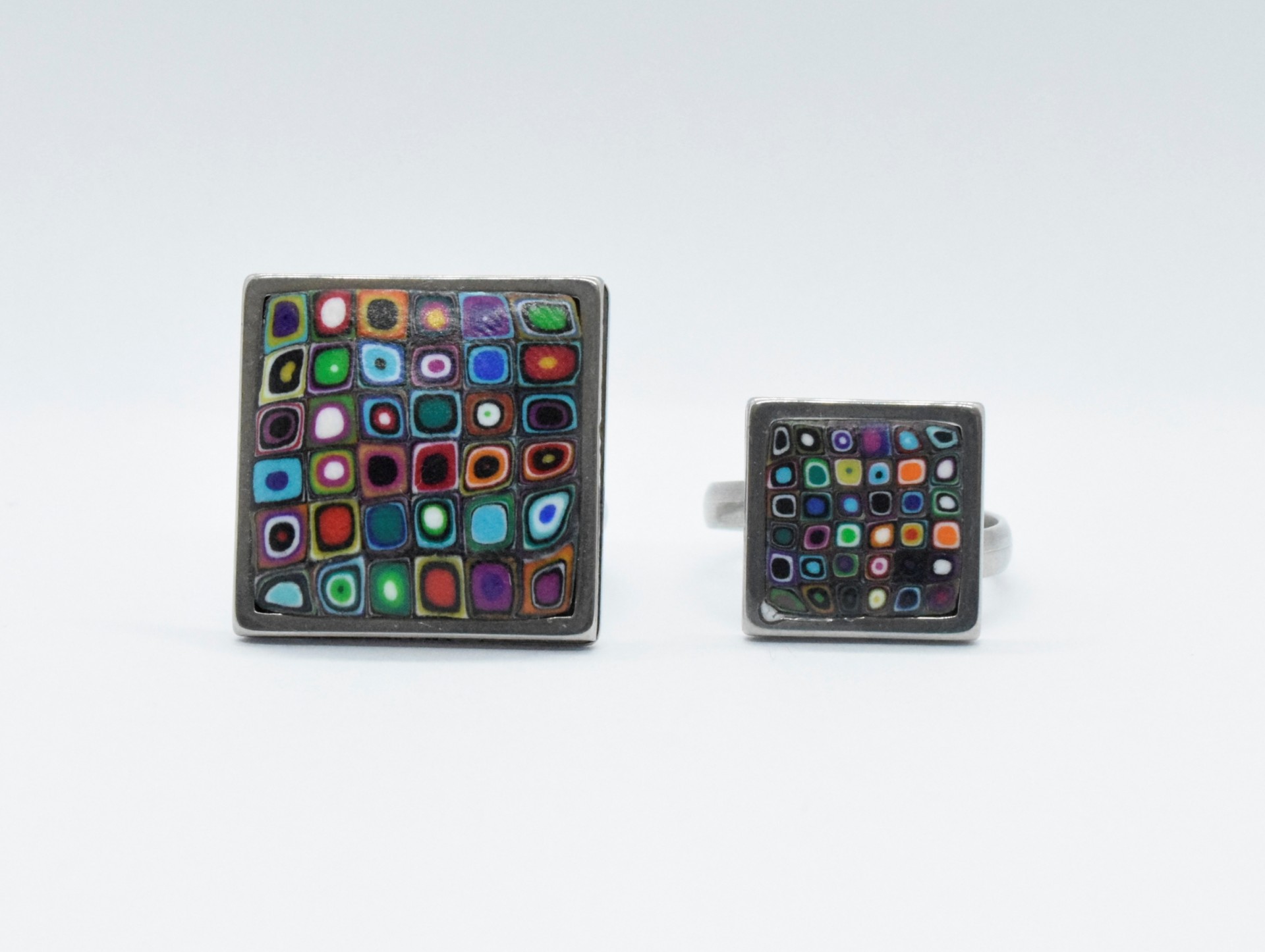 • Anel metálico com superfície quadrada colorida