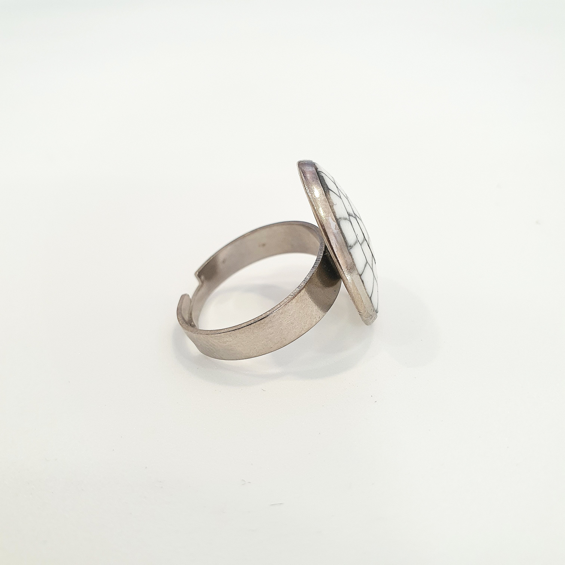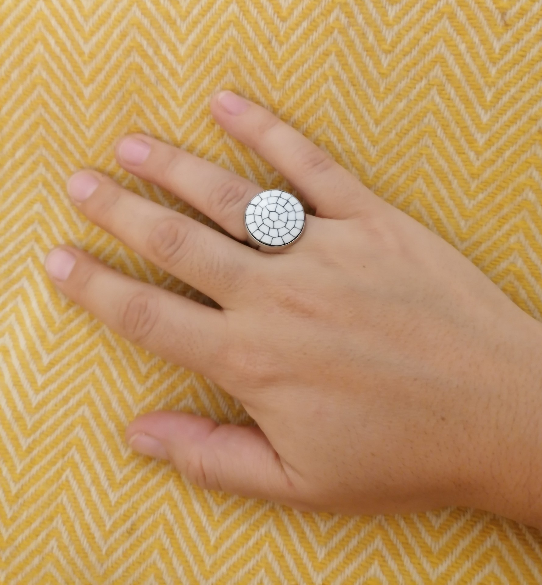 Anel Calçada Portuguesa 8,00 € Desconto de %. IVA incluído. Partilhar Diâmetro do círculo Anel 'S' - 20mm Anel 'M' - 25mm Comprar Contactar Características Cores da argila: Branco e Preto Metal: Liga de metal prateado - Antialérgico Diâmetro anelar: ajustável Dimensões e Peso: Anel "S": Círculo com 20mm de diâmetro / Peso: 3,5 gr Anel "M": Círculo com 25mm de diâmetro / Peso: 5 gr As cores dos produtos poderão sofrer ligeiras alterações devido à reprodução fotográfica. Tags anelacessoriosacessorios de açoanel antialergicocalçada portuguesa Características