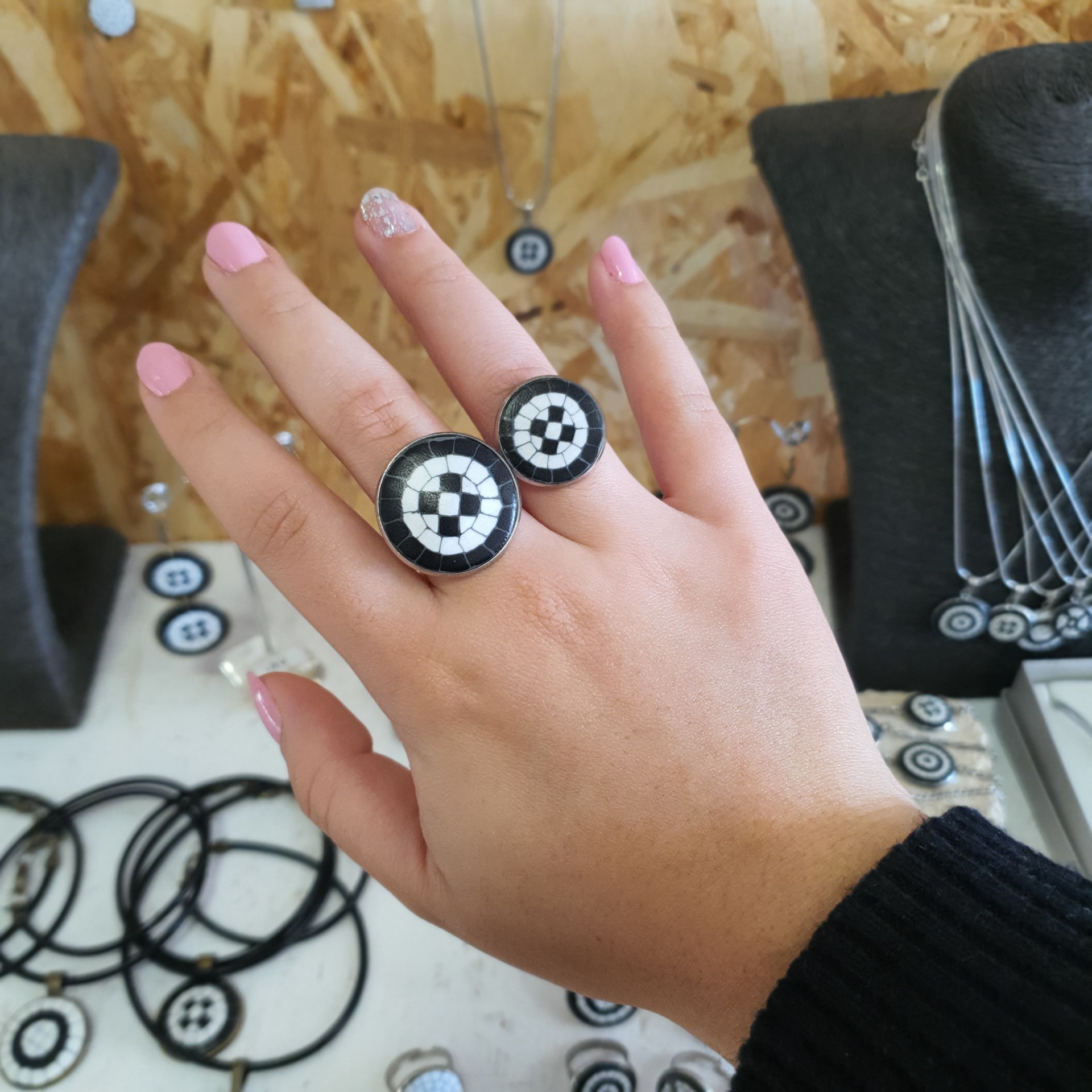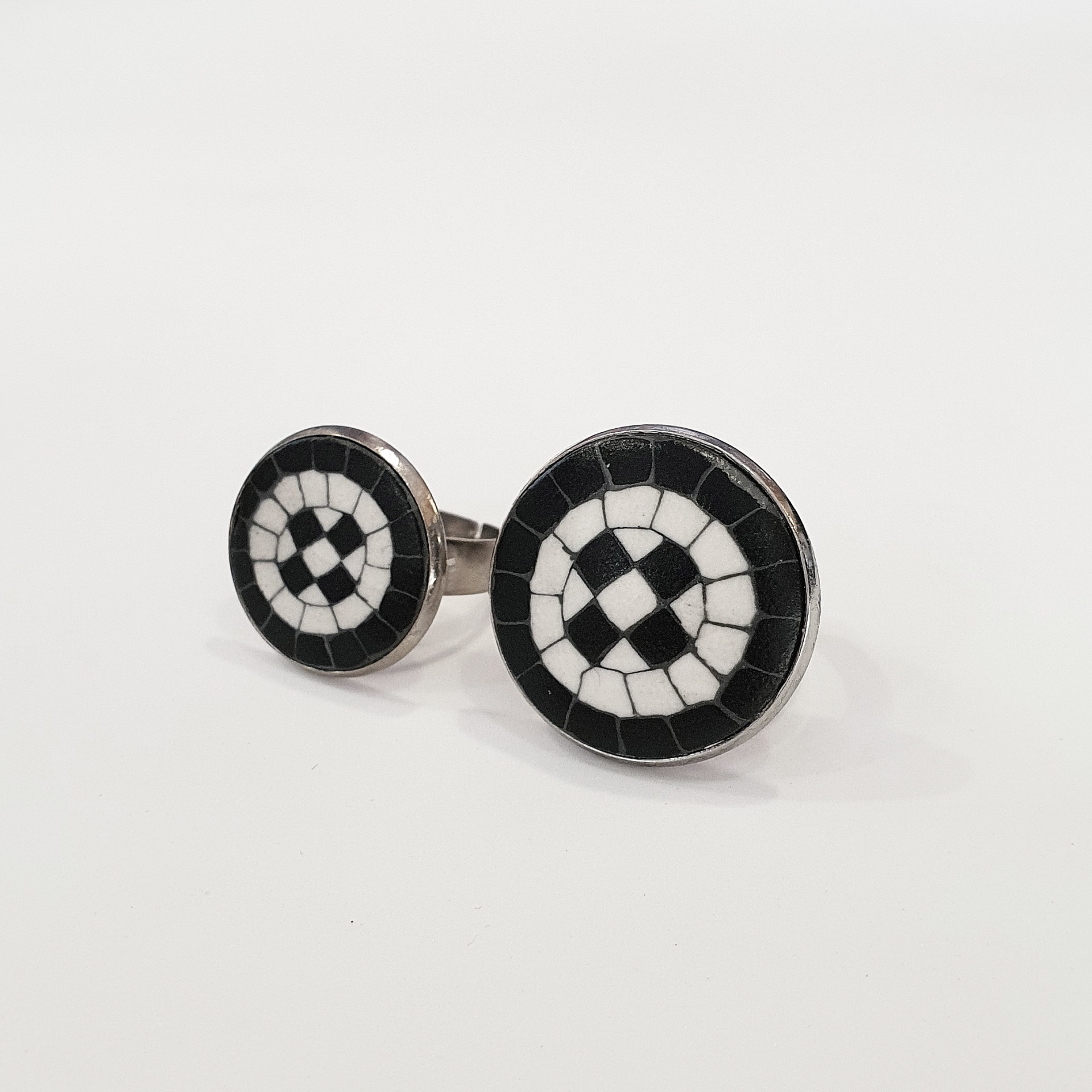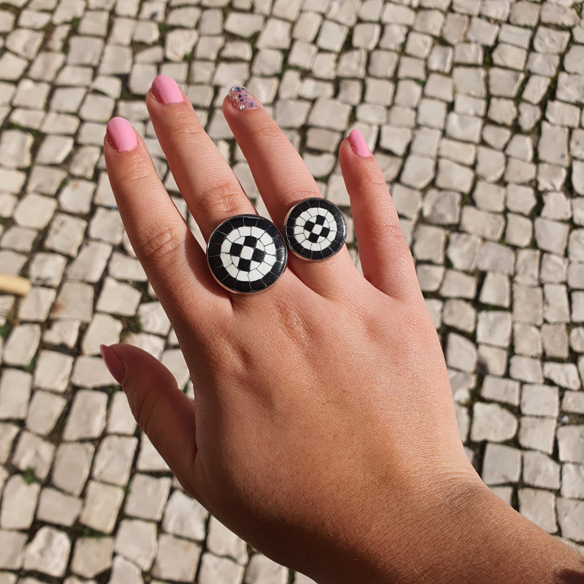 Anel Calçada Portuguesa 8,00 € Desconto de %. IVA incluído. Partilhar Diâmetro do círculo Anel 'S' - 20mm Anel 'M' - 25mm Comprar Contactar Características Cores da argila: Branco e Preto Metal: Liga de metal prateado - Antialérgico Diâmetro anelar: ajustável Dimensões e Peso: Anel "S": Círculo com 20mm de diâmetro / Peso: 3,5 gr Anel "M": Círculo com 25mm de diâmetro / Peso: 5 gr As cores dos produtos poderão sofrer ligeiras alterações devido à reprodução fotográfica. Tags anel antialergicoanelanel calçada portuguesaanel liga de metalpreto e branco Características