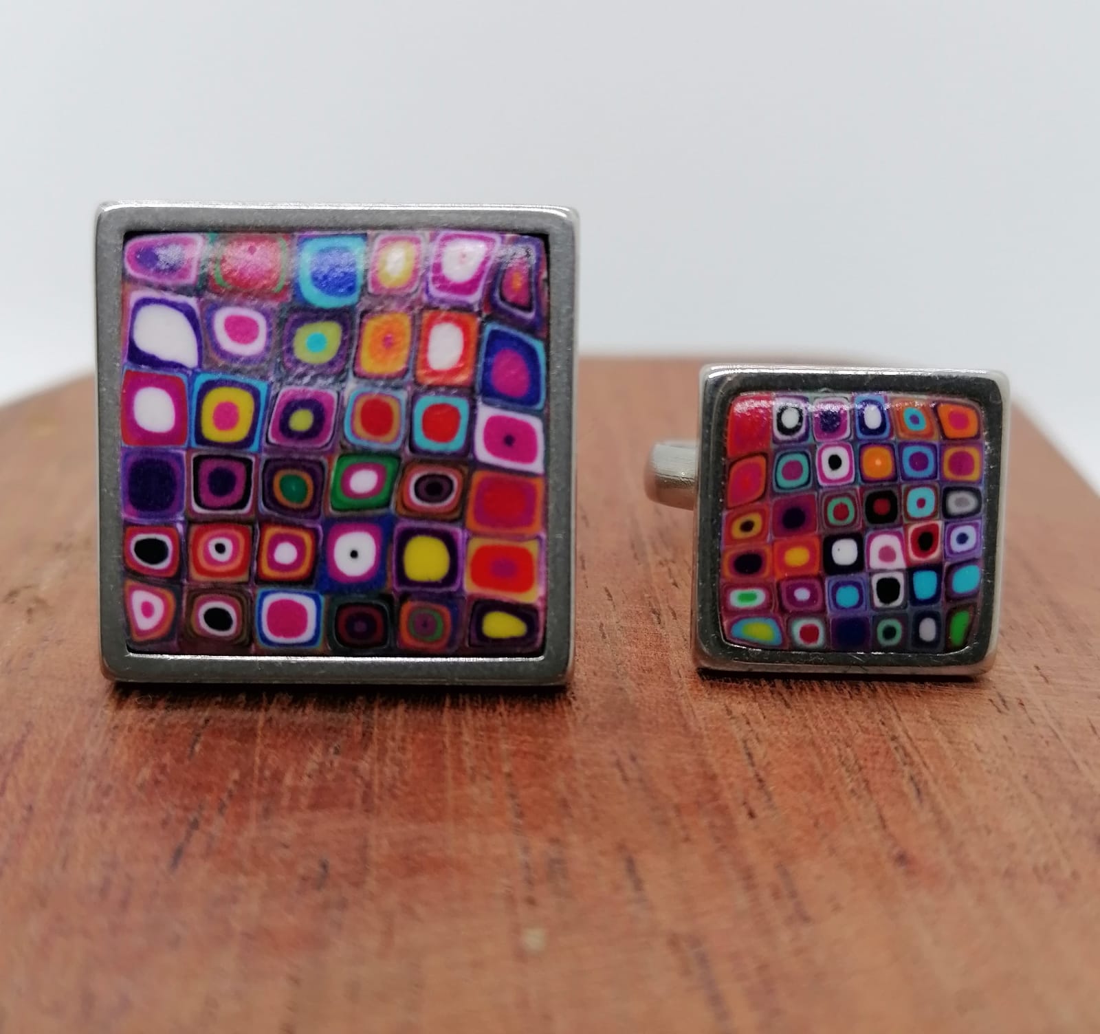 • Anel e anel de falange quadrados coloridos em metal prateado sobre madeira