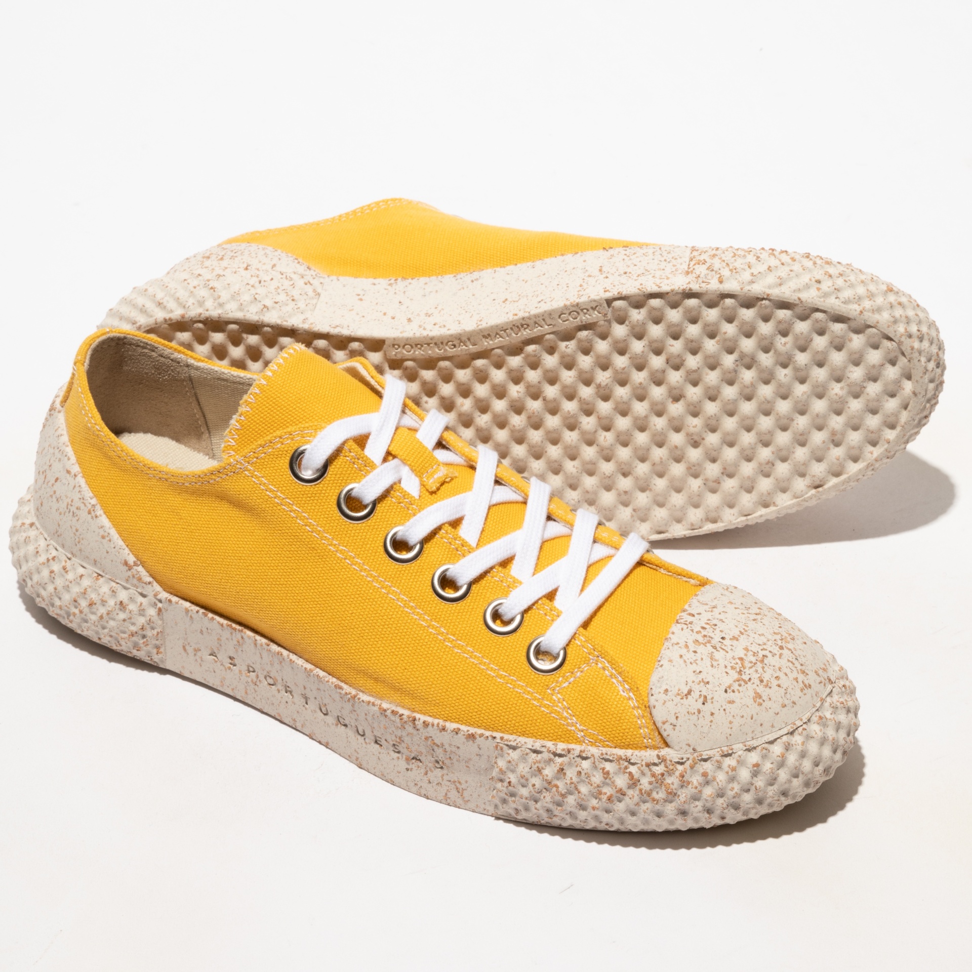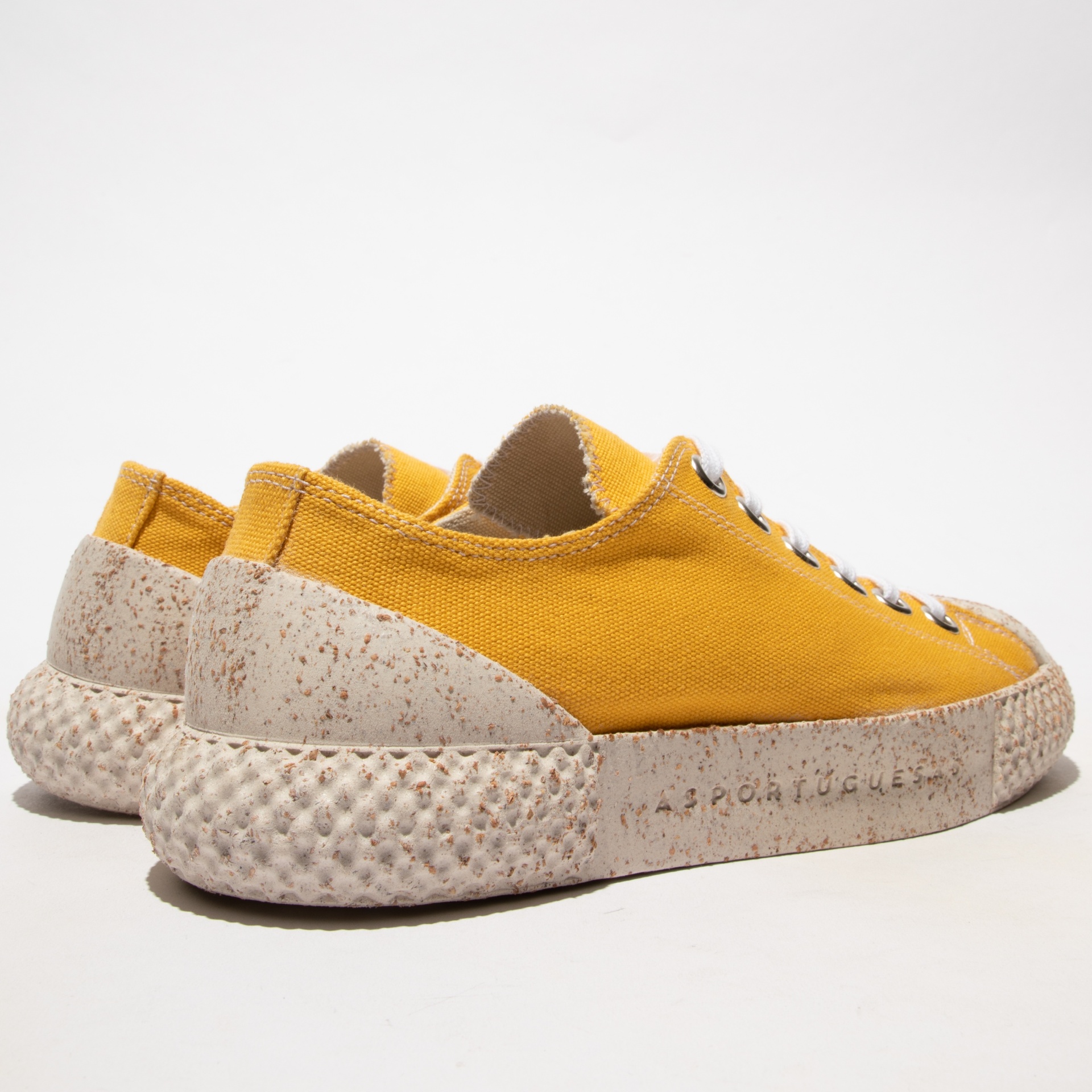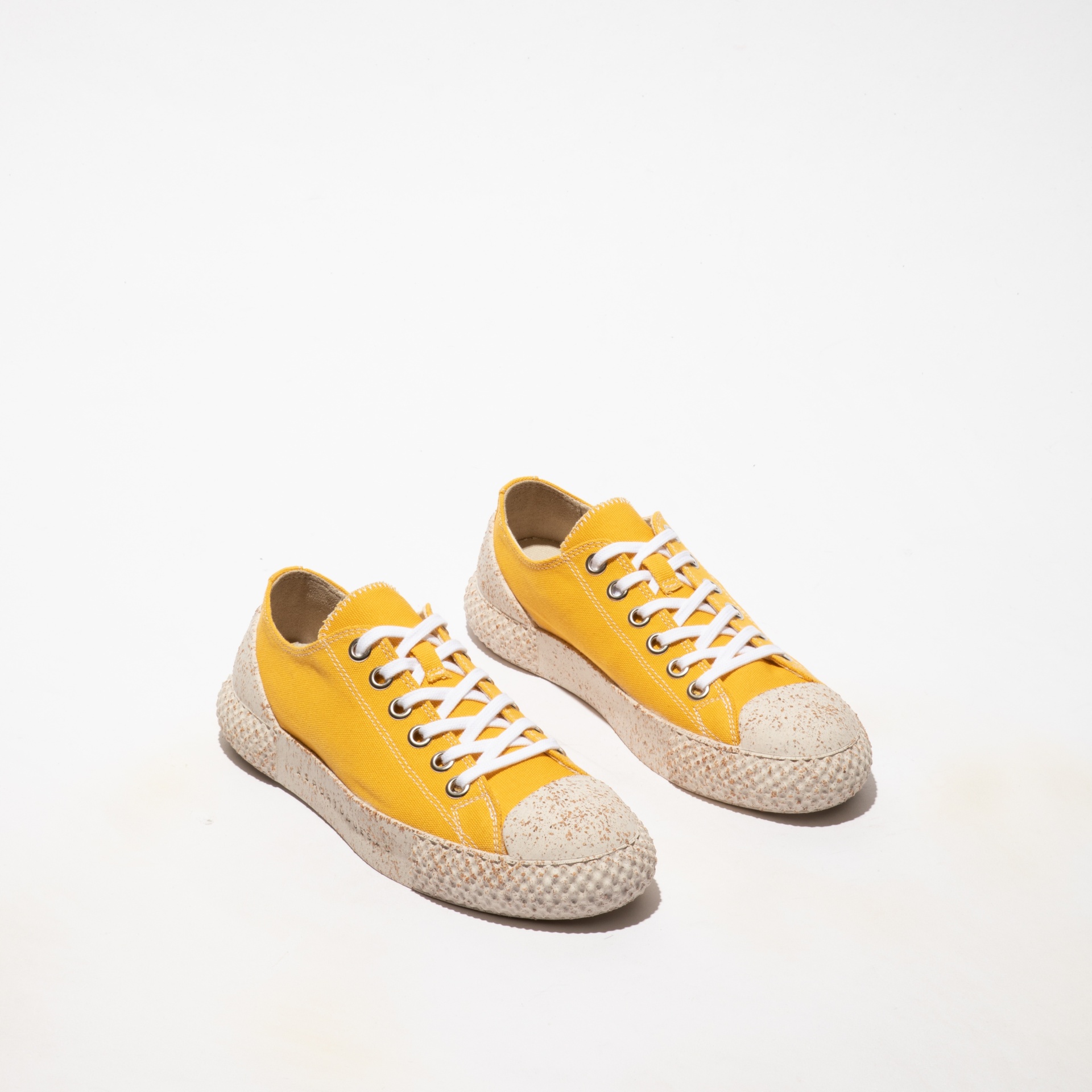 • Ténis amarelos com sola bege texturada e atacadores pretos e brancos em fundo branco