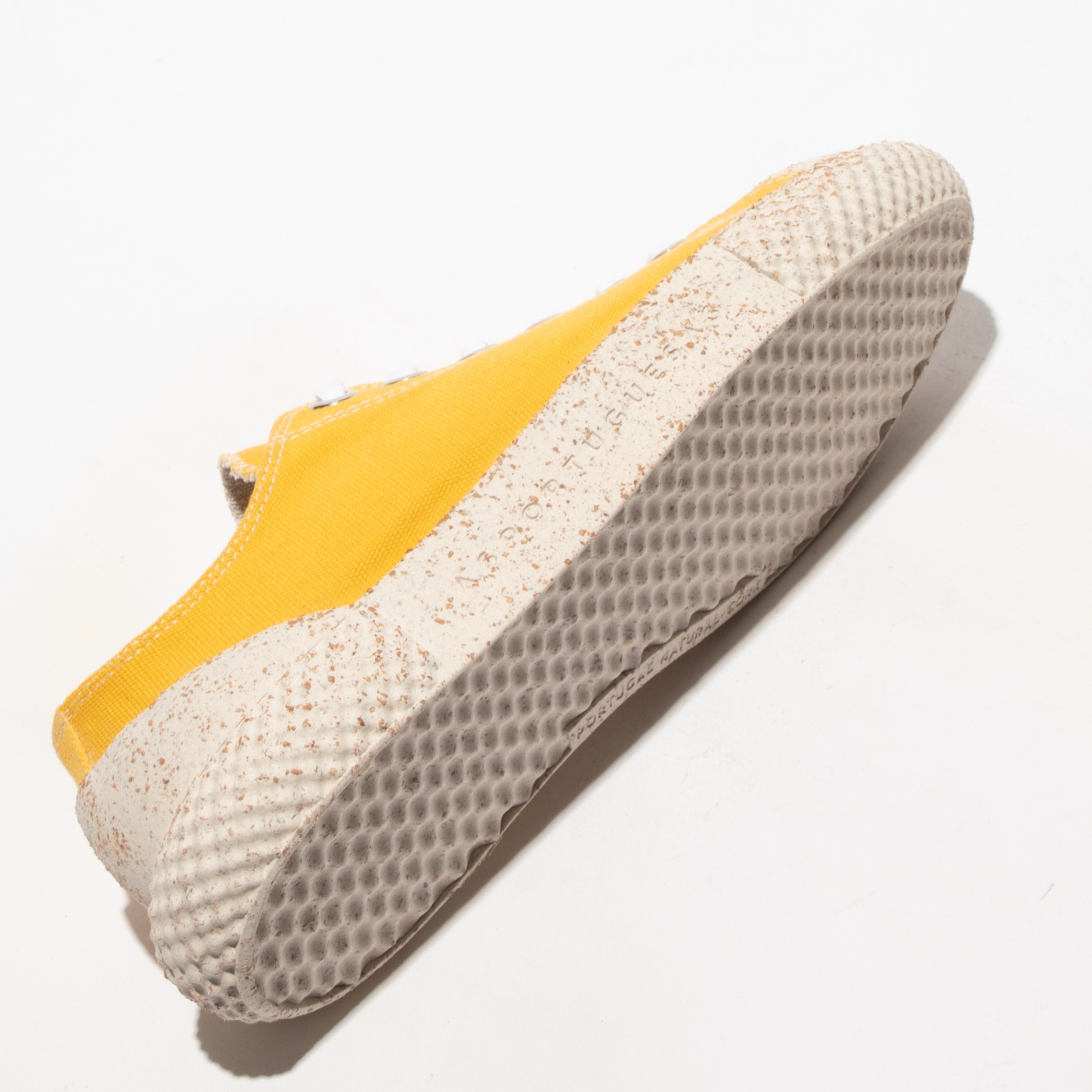 • Ténis amarelos com sola branca e texturizada vistos de baixo