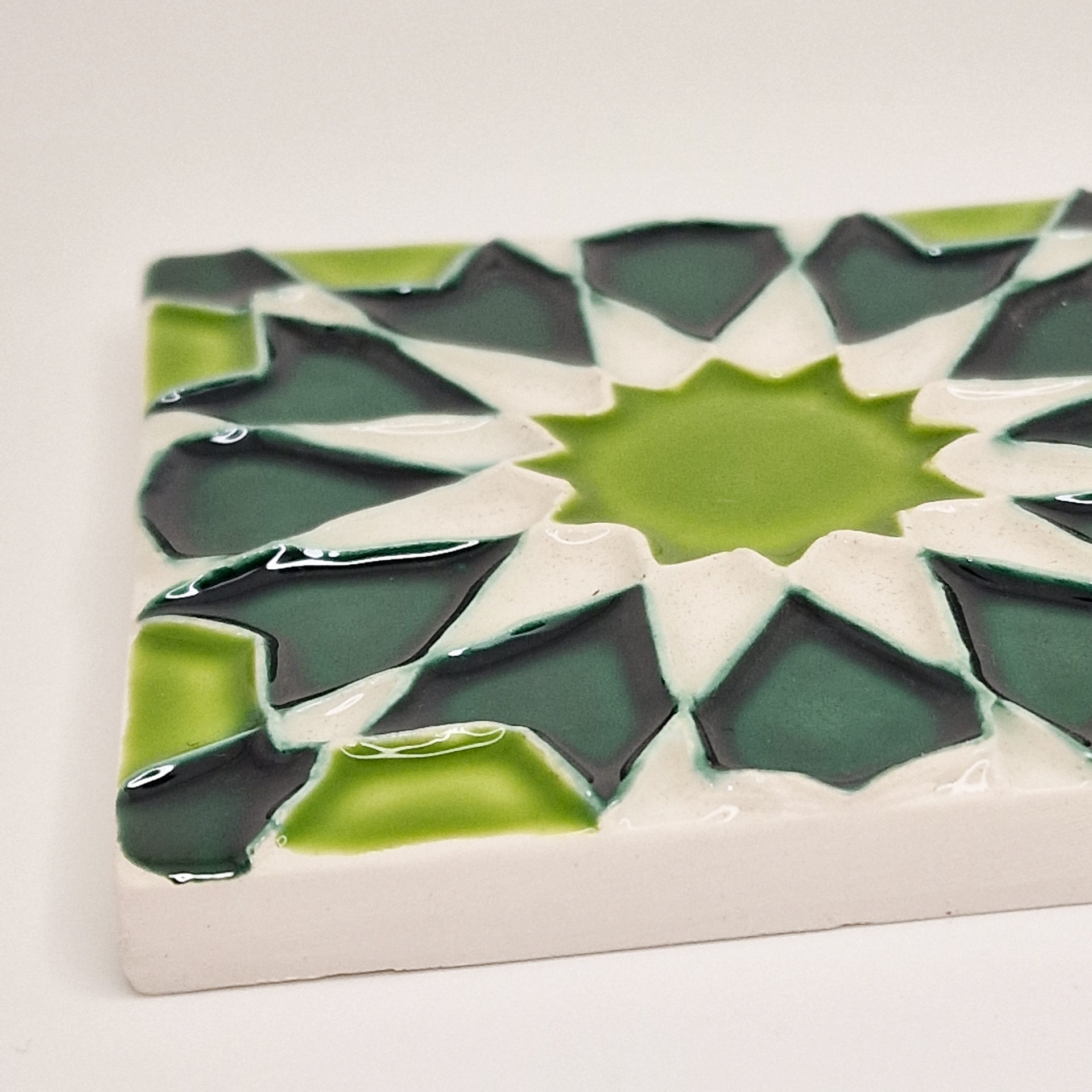 • Azulejo cerâmico quadrado com padrão geométrico verde e branco