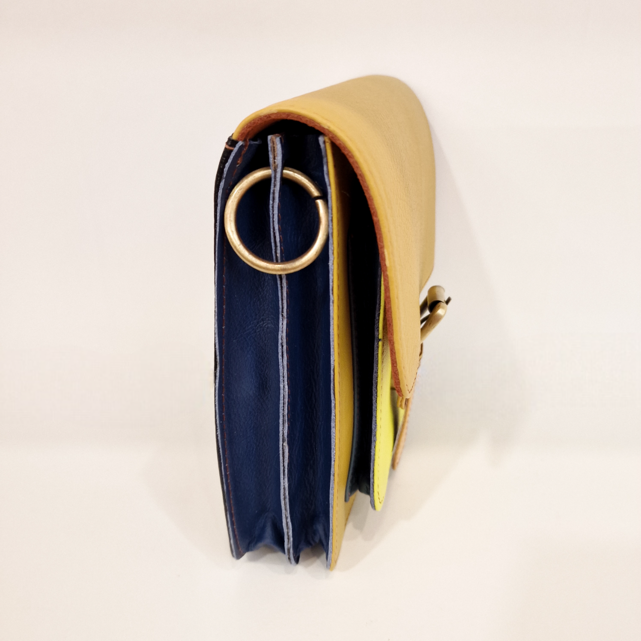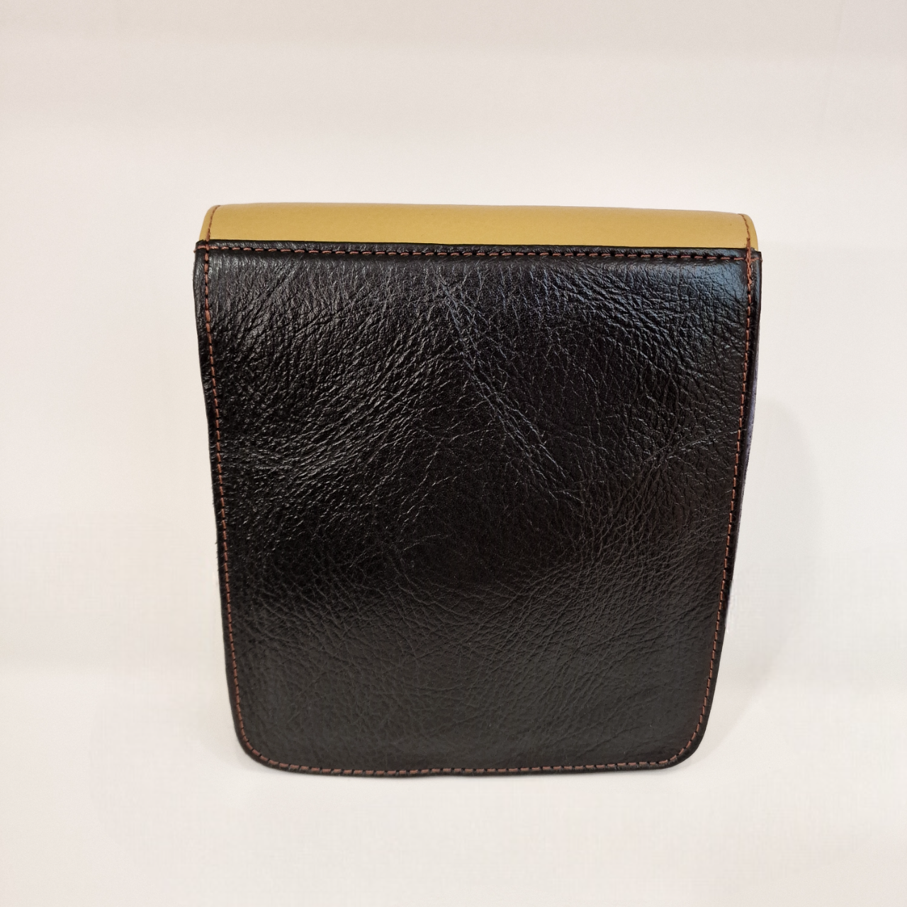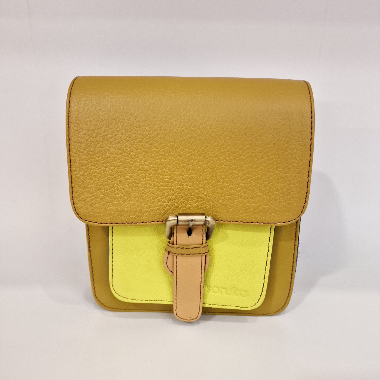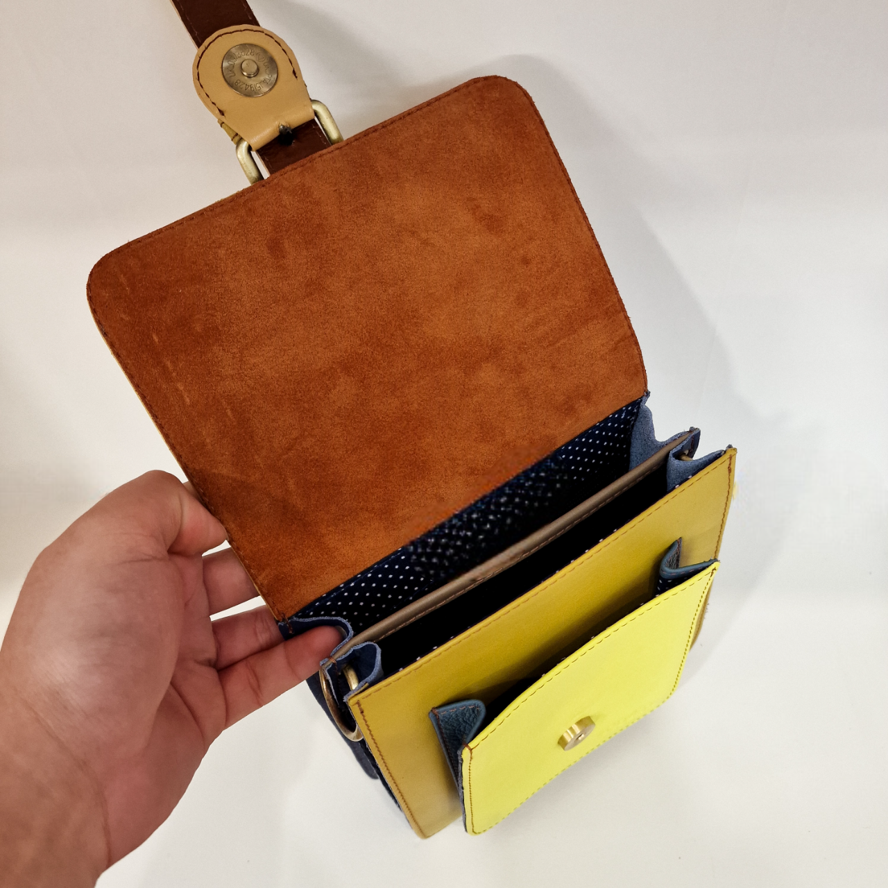 • Mala pequena quadrada em couro amarelo e castanho com fecho de fivela
