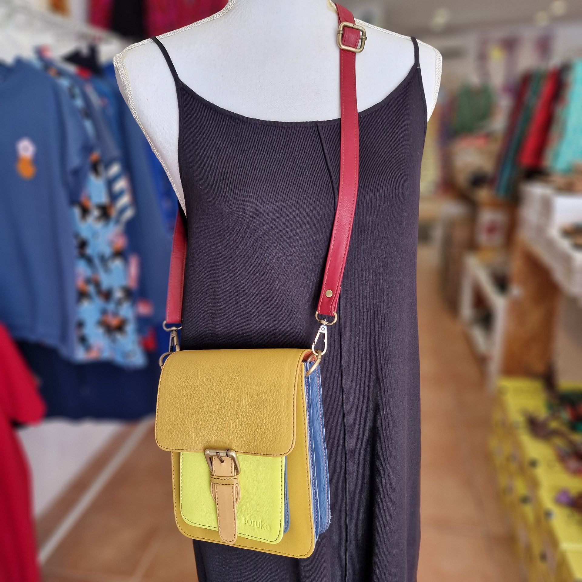 • Mala tiracolo colorida em couro exposta num manequim com vestido preto