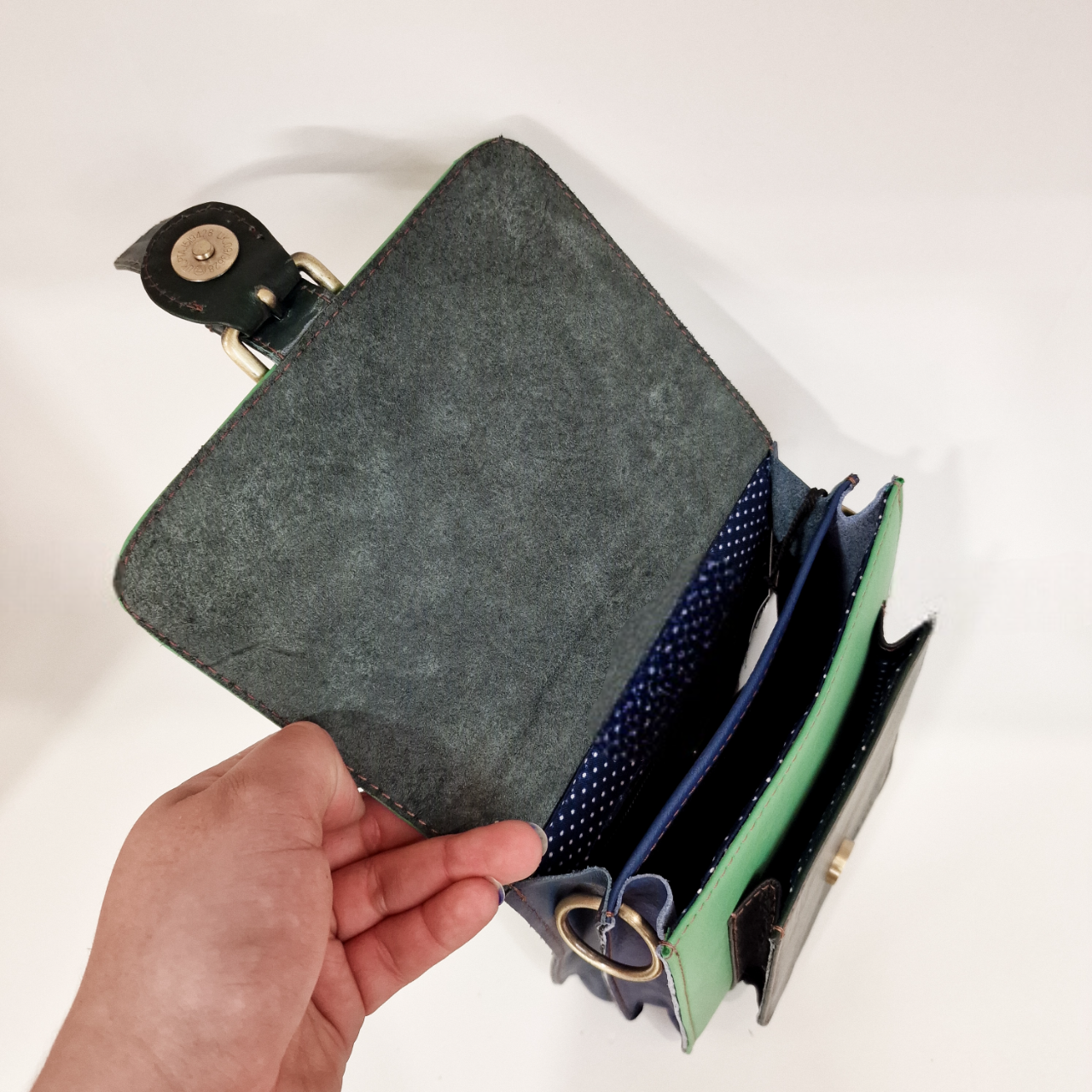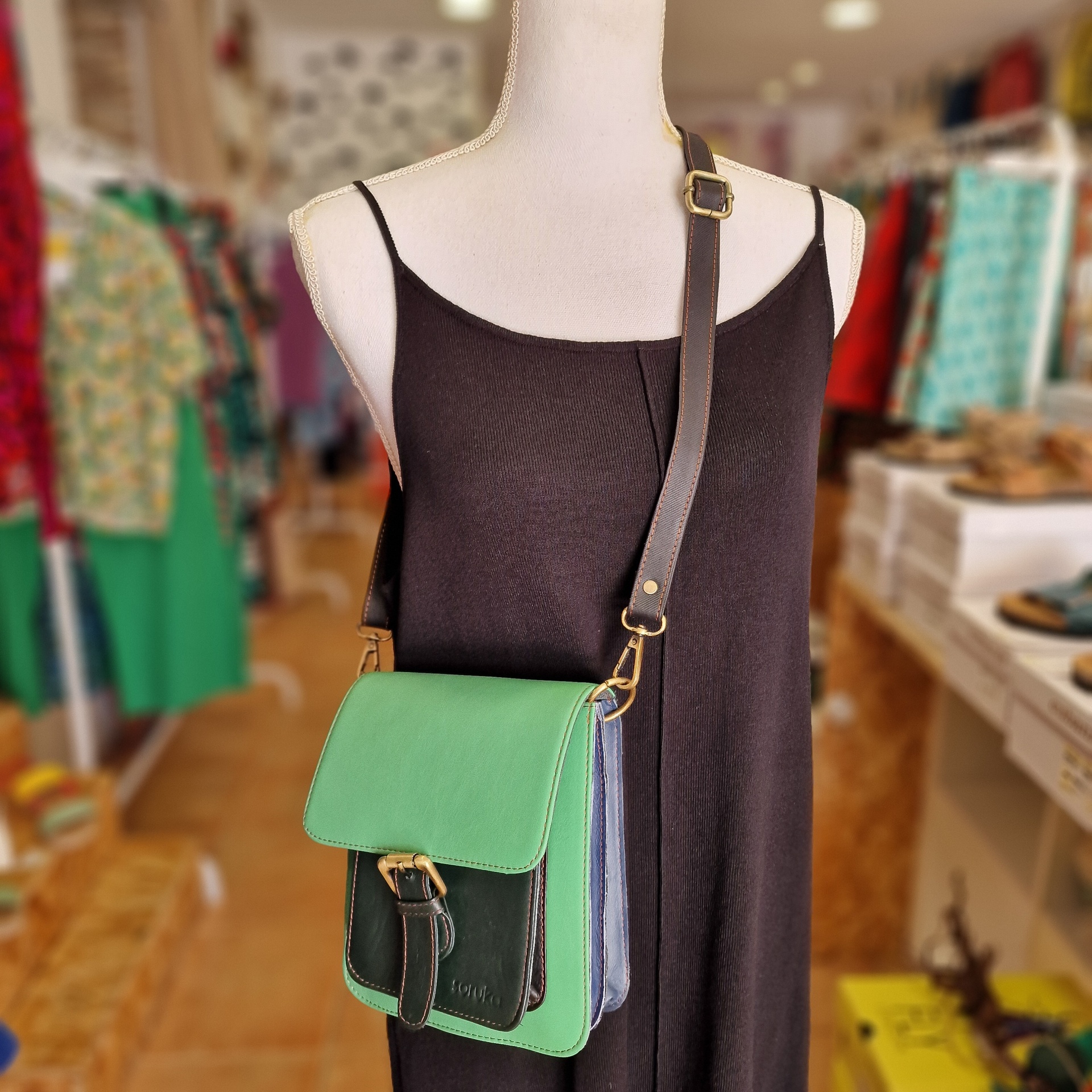 Bolsa 100% couro reciclado, inclui uma alça de couro ajustável e extensível.