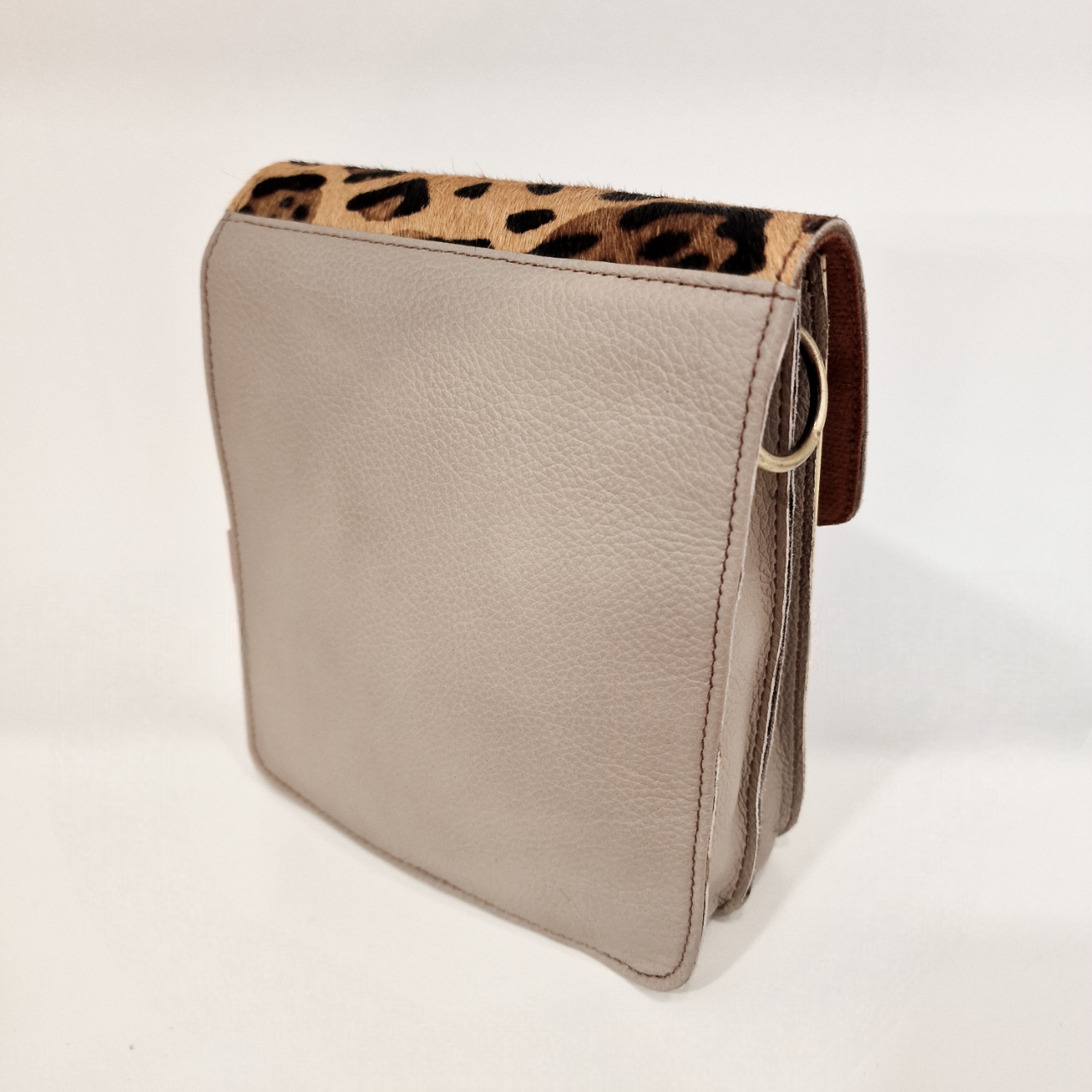 • Carteira de couro cinza com detalhe de pelo manchado tipo leopardo