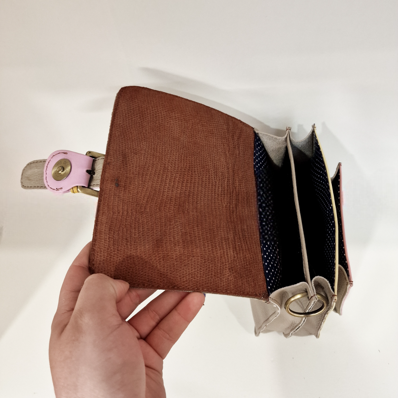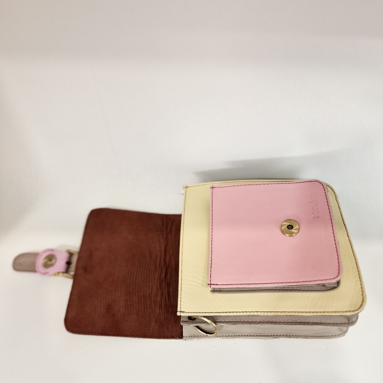 • Mala pequena bege com bolso rosa e interior castanho