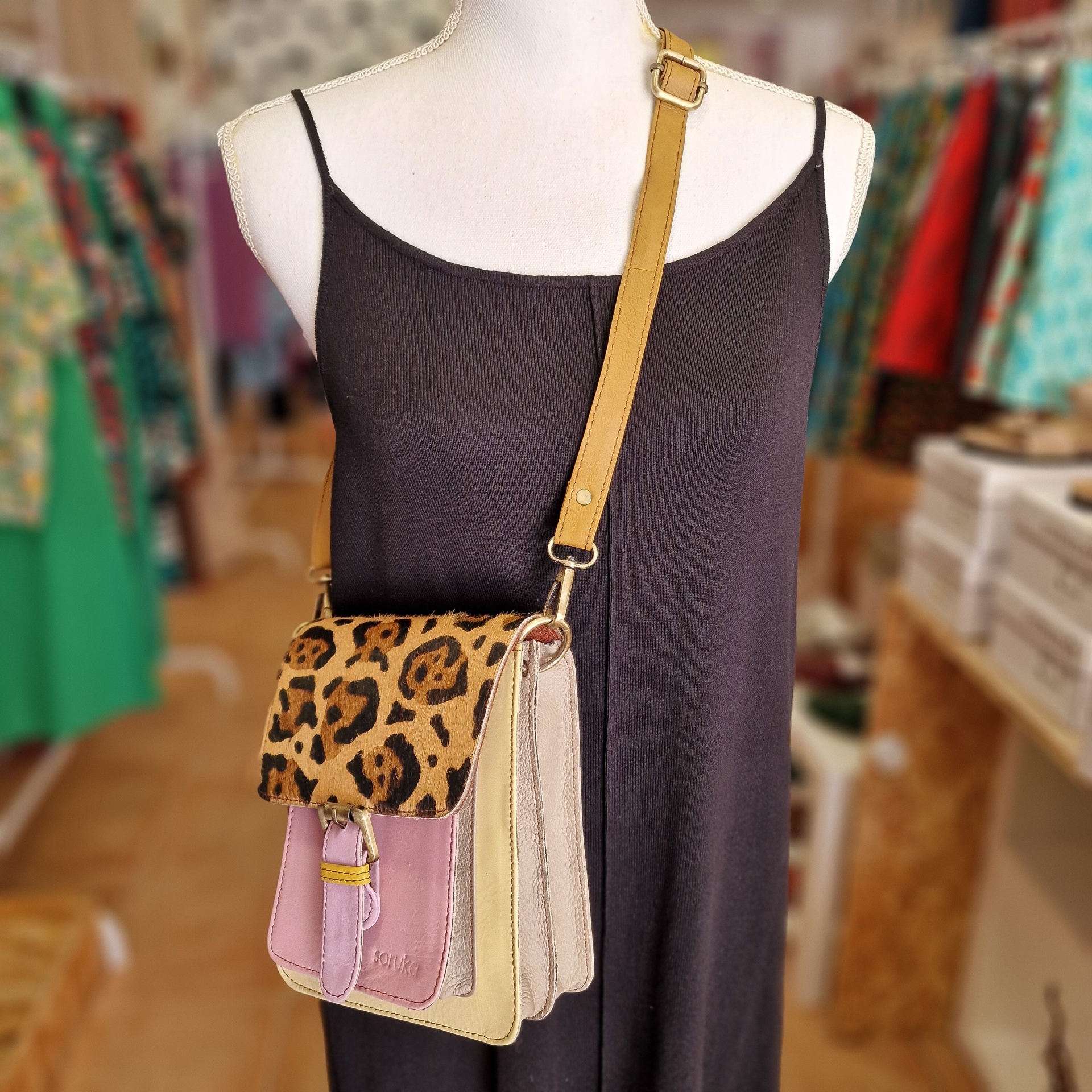 • Mala de senhora pequena tricolor com padrão animal print numa loja