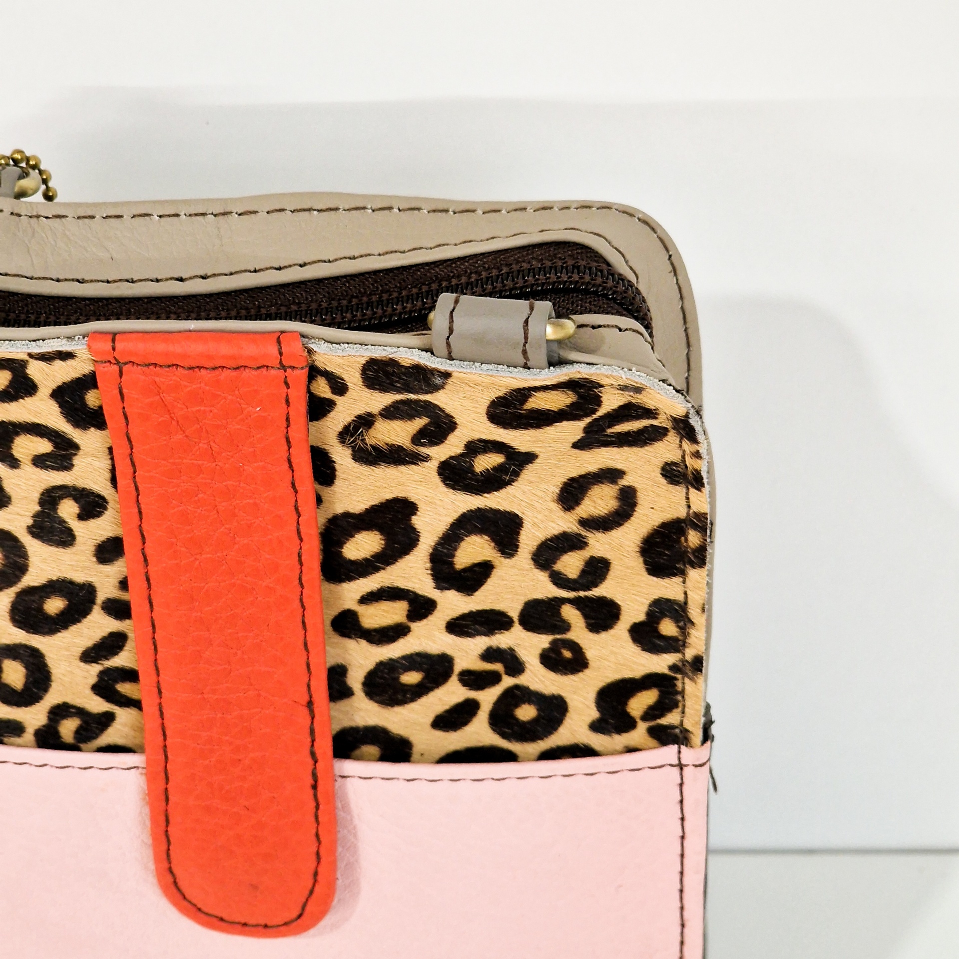 • Carteira em couro bege, rosa com padrão animal print castanho e preto