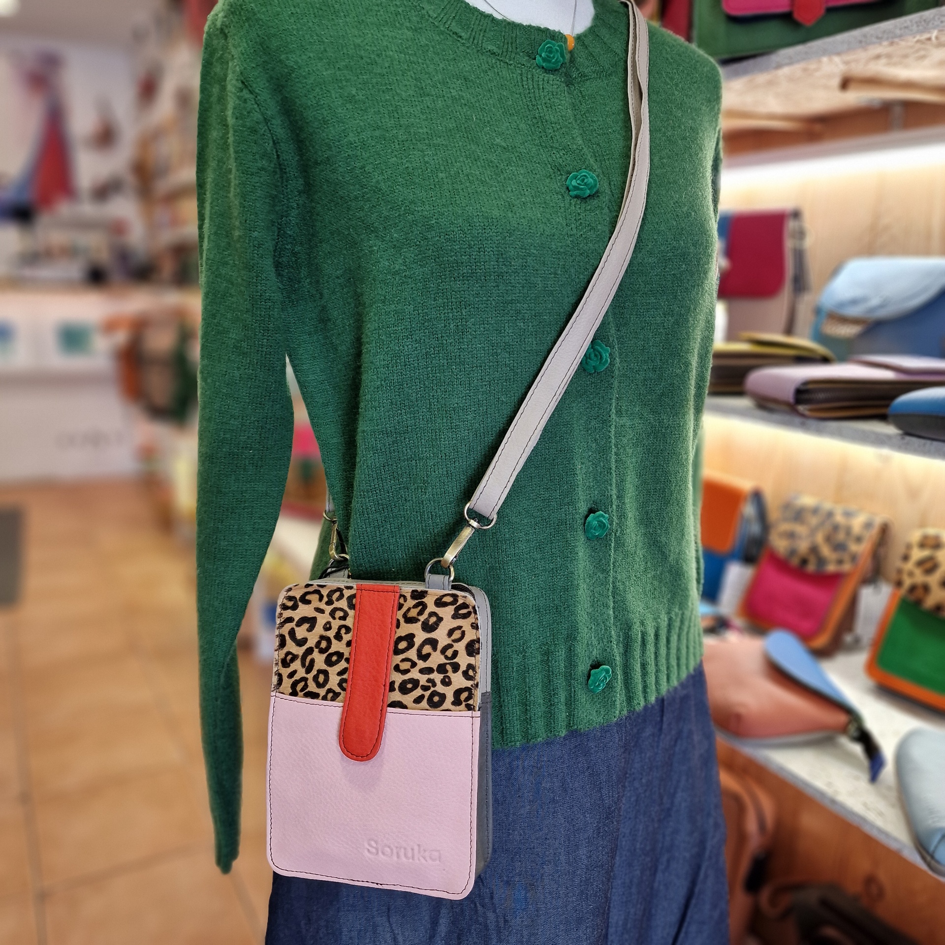• Bolsa transversal rosa claro com padrão leopardo exibida num manequim com casaco verde e saia azul