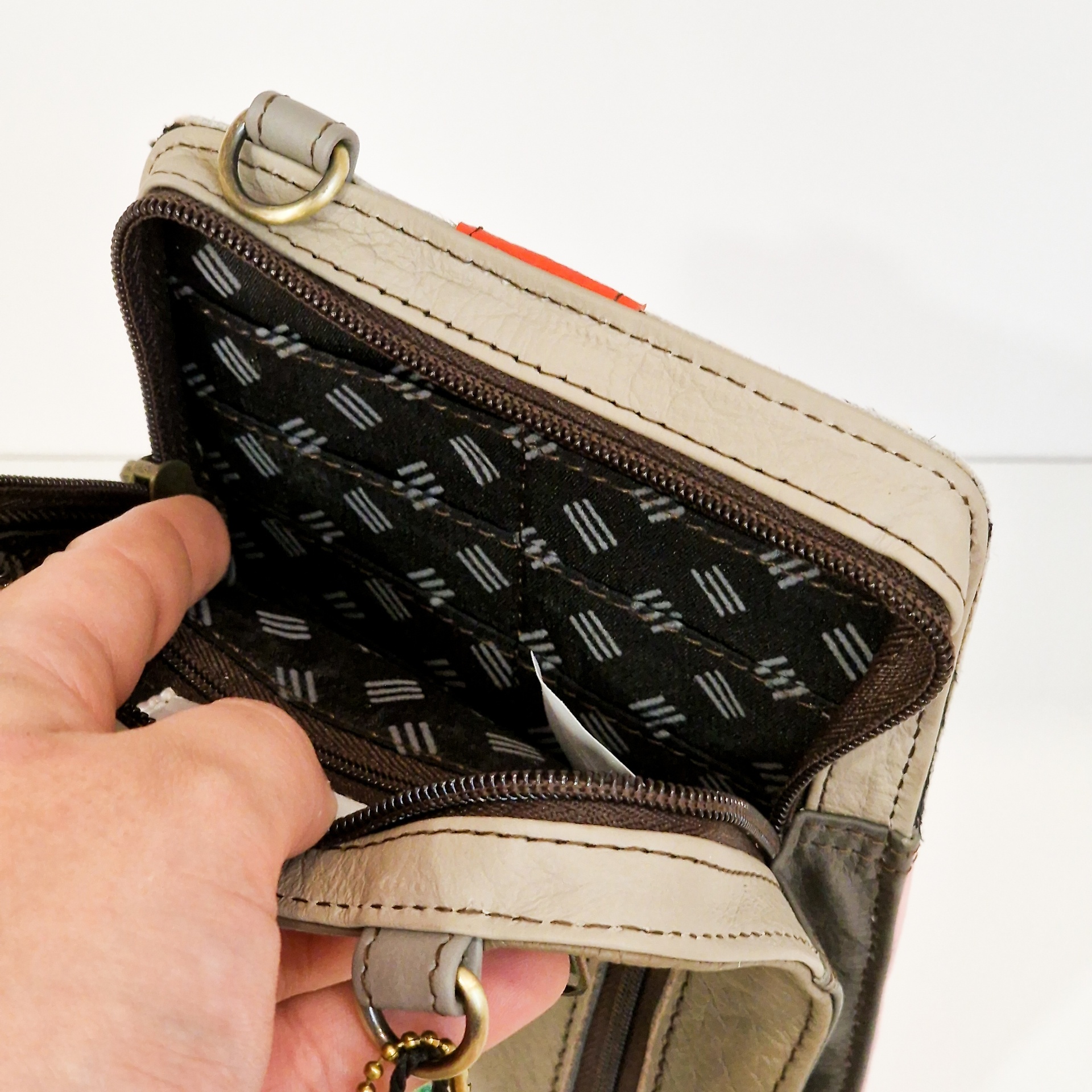 • Carteira bege em pele sintética com fecho de zíper castanho e interior com padrão de riscos.