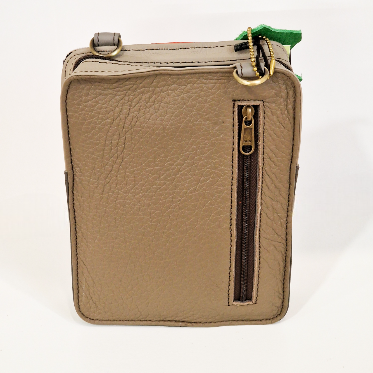 • Mala pequena de pele castanha com fecho de correr vertical e argolas metálicas