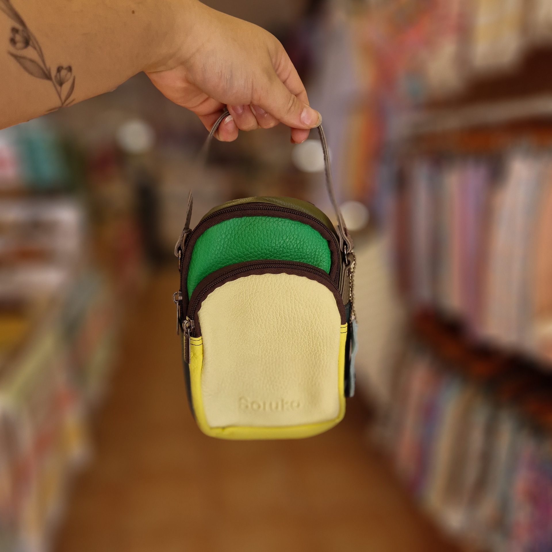 • Bolsa pequena colorida segurada por mão com tatuagem