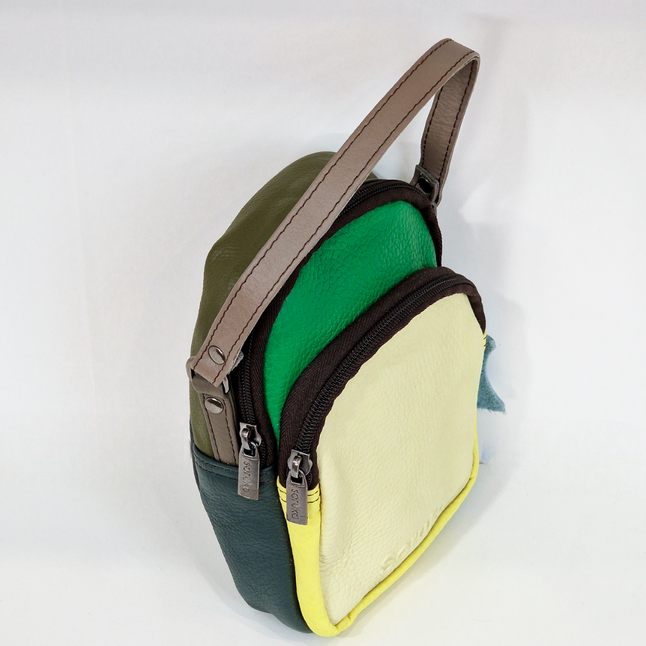 • Mala pequena de mão colorida com alça castanha e texto SoruKa