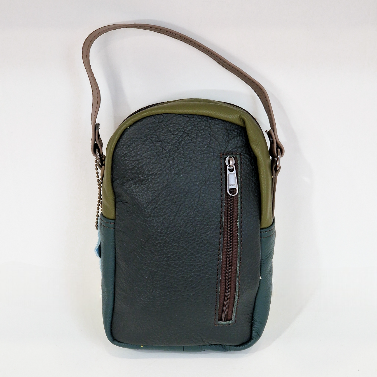 • Bolsa pequena em couro preto, verde escura e verde oliva com fecho vertical e alça castanha