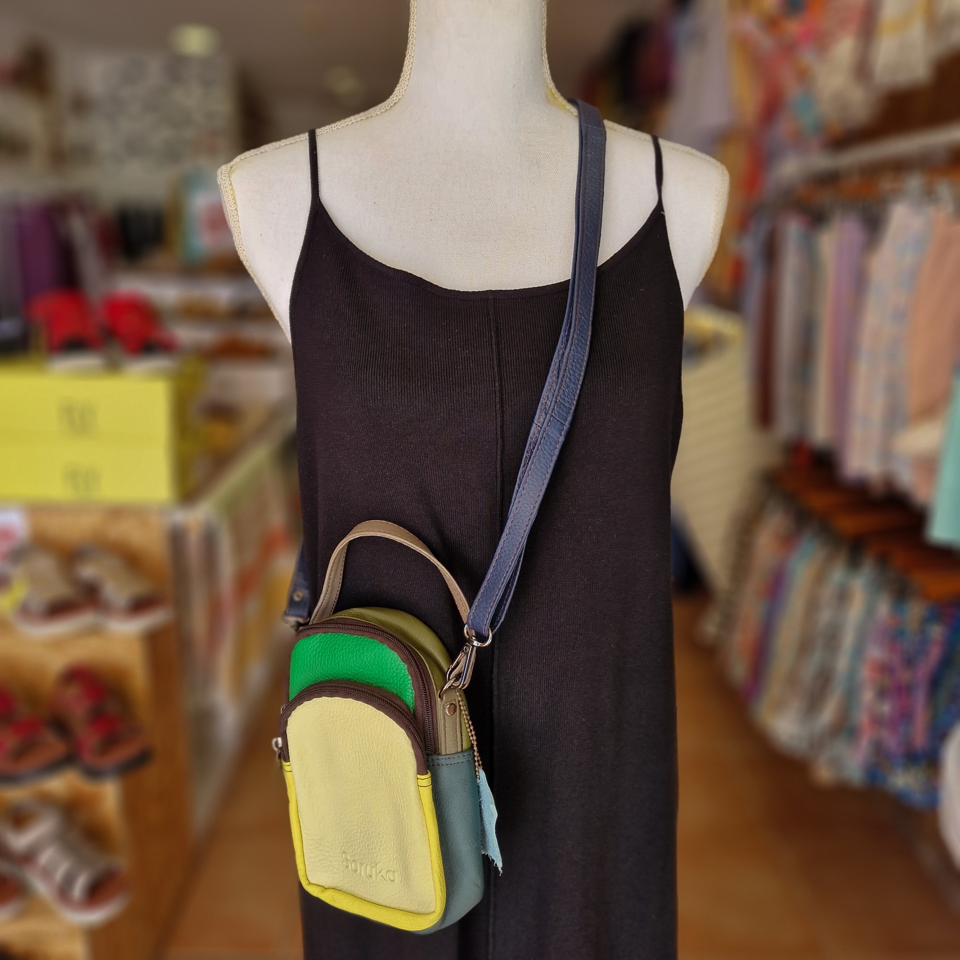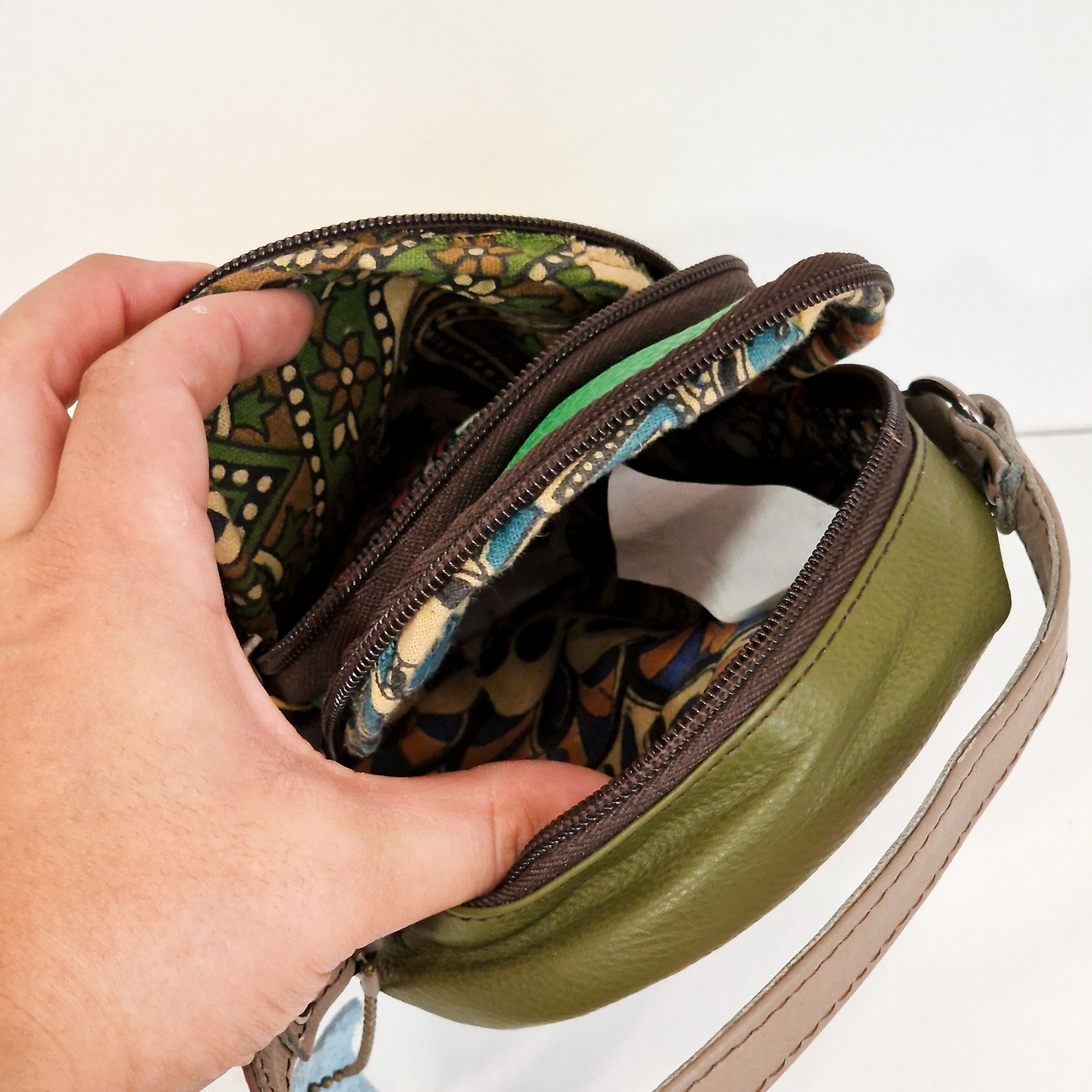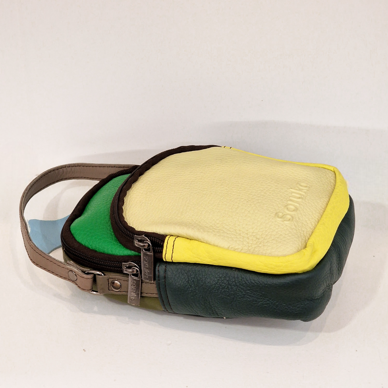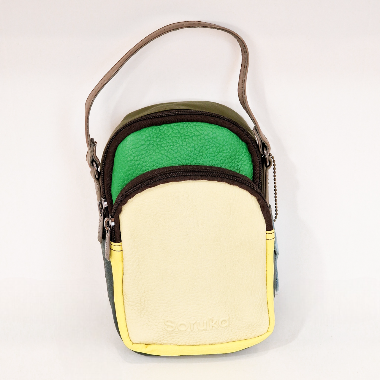 Bolsa 100% couro reciclado, inclui uma alça de couro ajustável e extensível.
