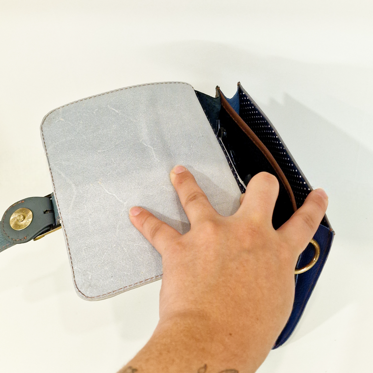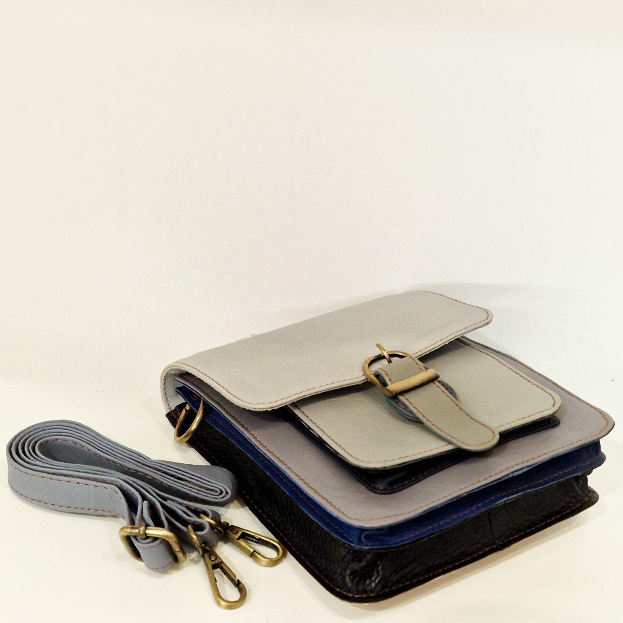 • Carteira pequena de couro cinza, azul e preto com fecho de fivela e alça removível cinza.