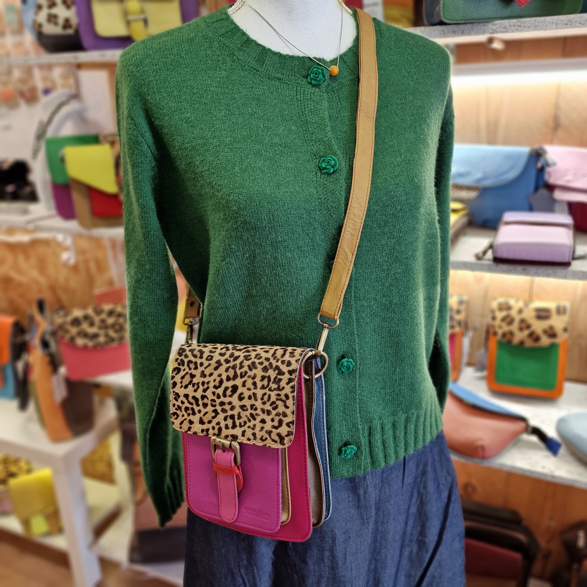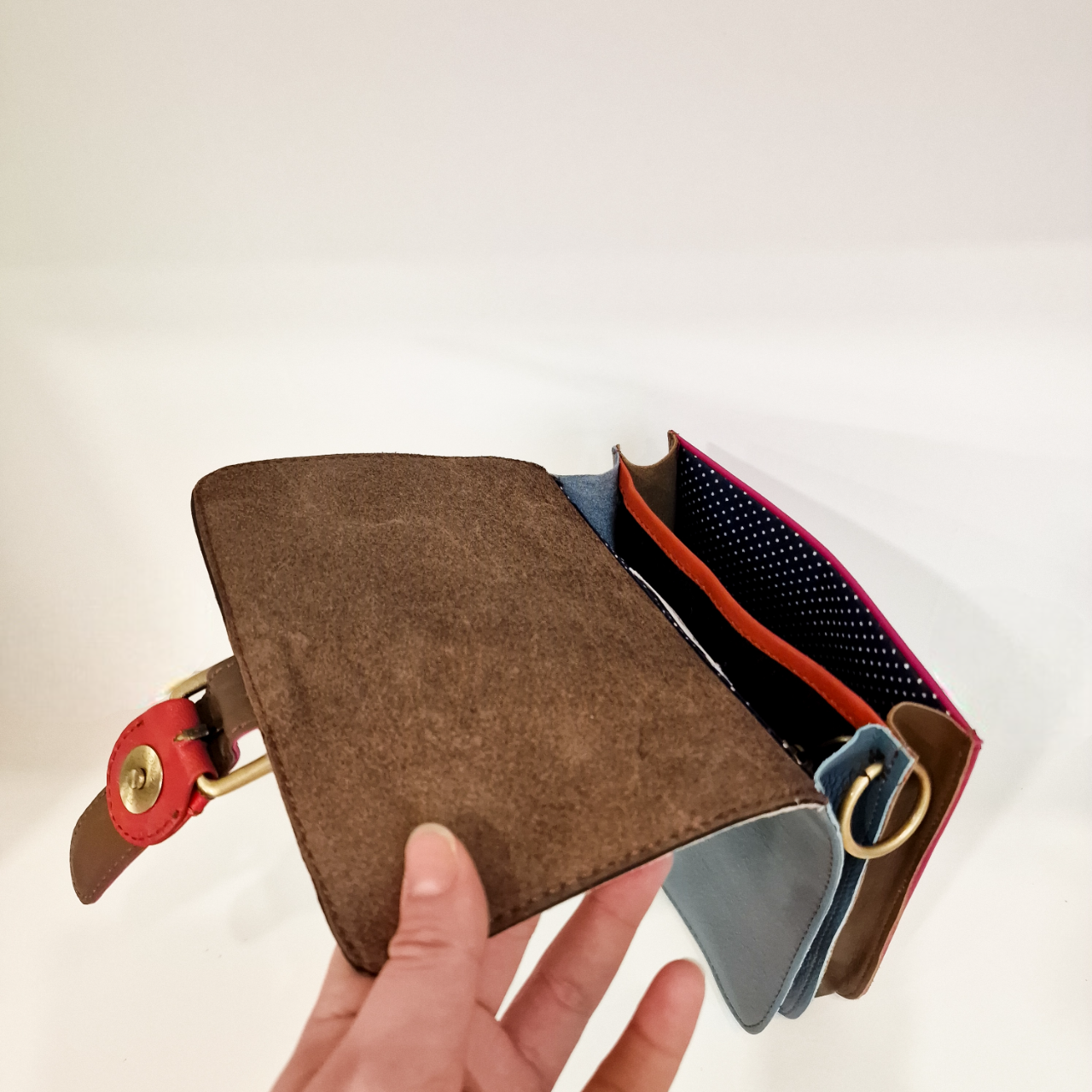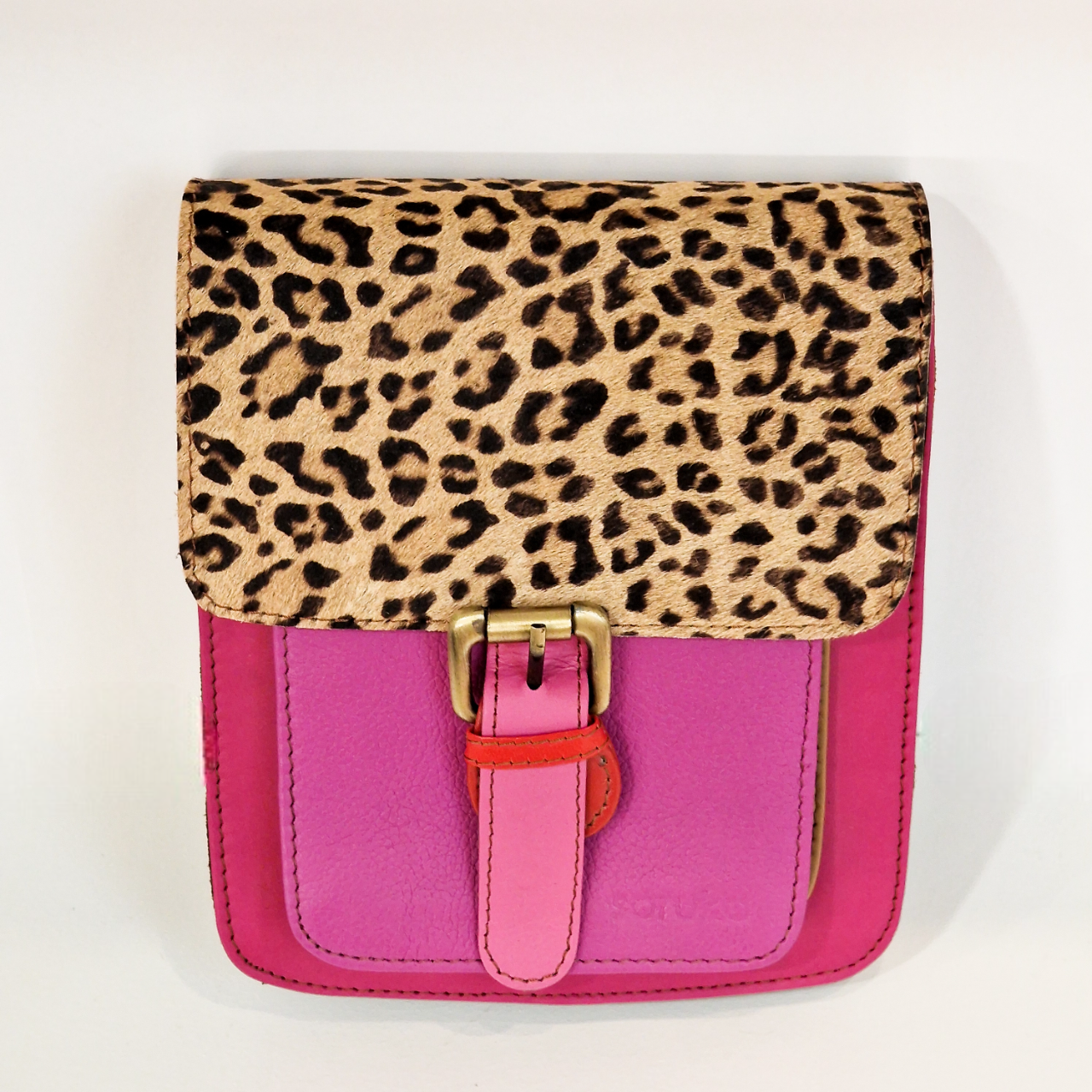 Bolsa 100% couro reciclado, inclui uma alça de couro ajustável e extensível.