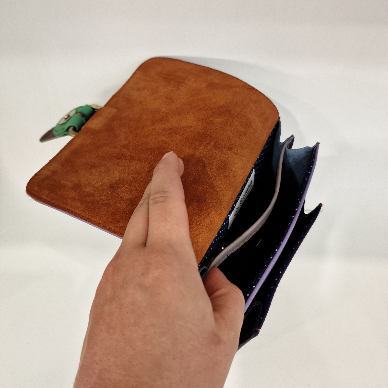 Bolsa 100% couro reciclado, inclui uma alça de couro ajustável e extensível.