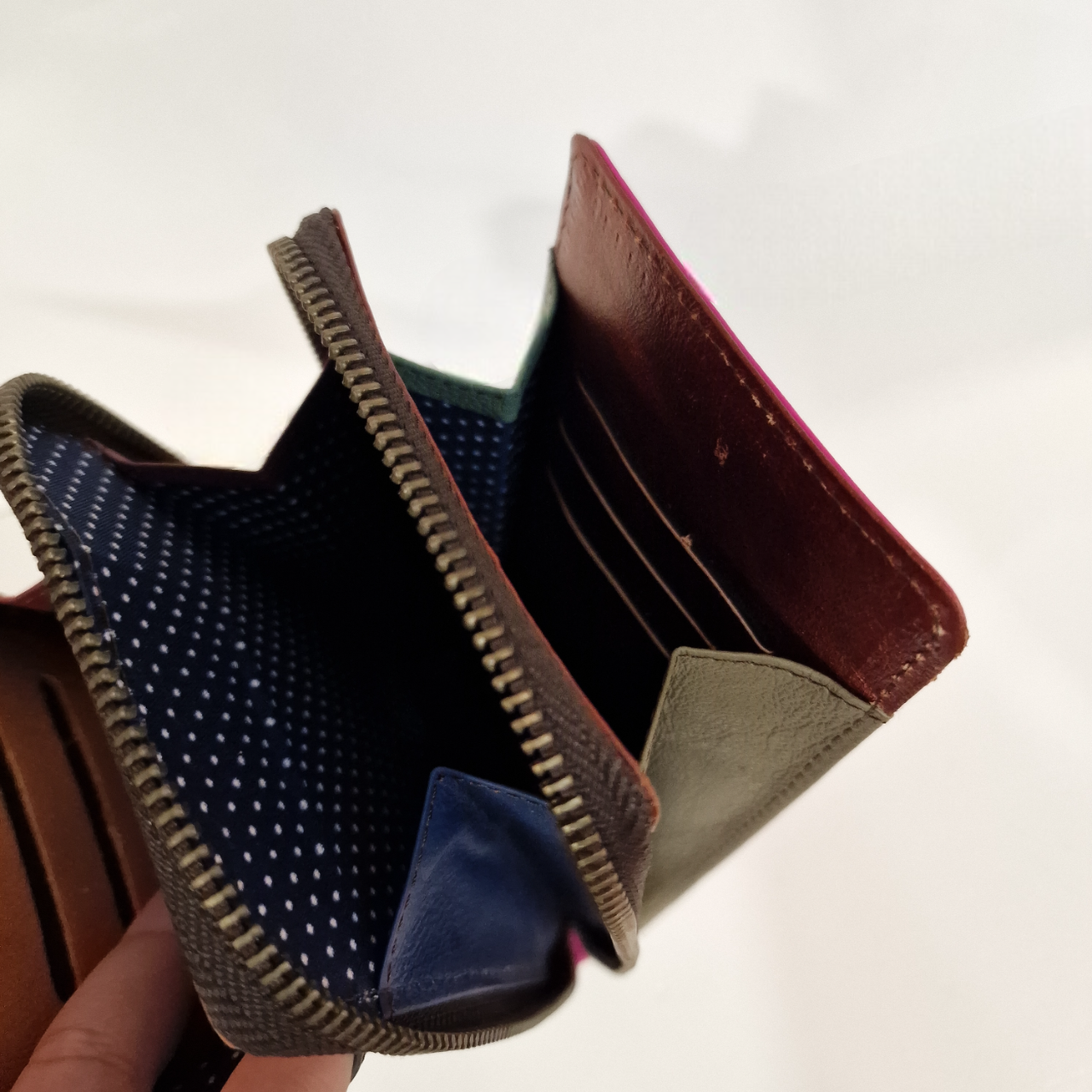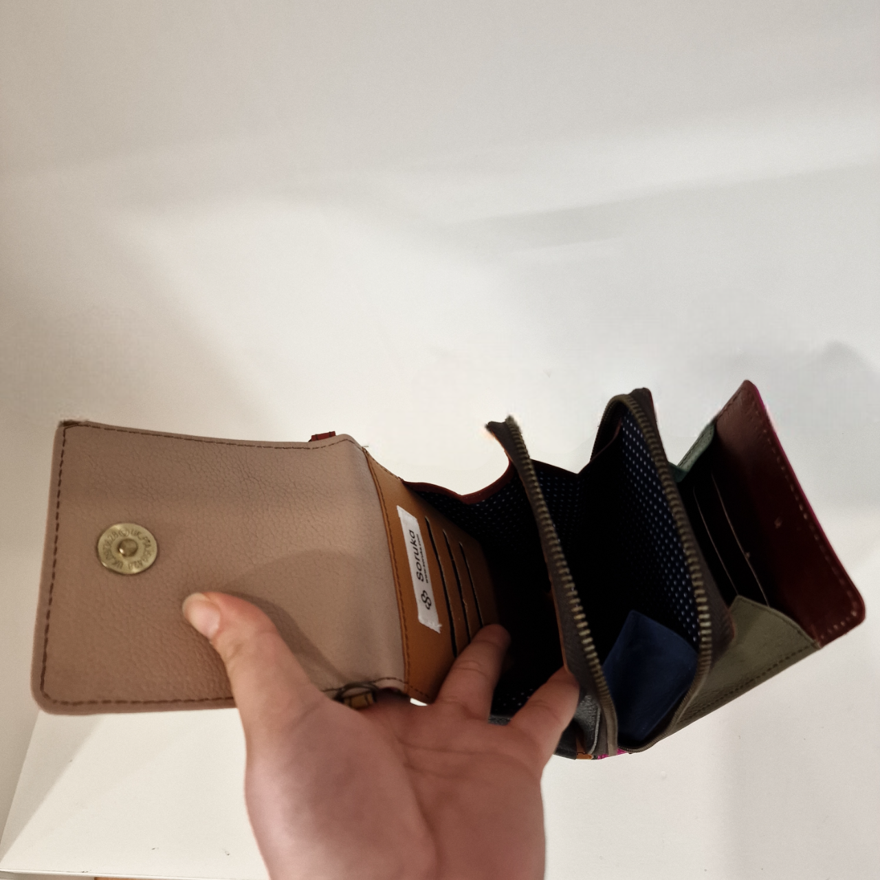 • Carteira multicolorida aberta com compartimentos visíveis e uma mão segurando