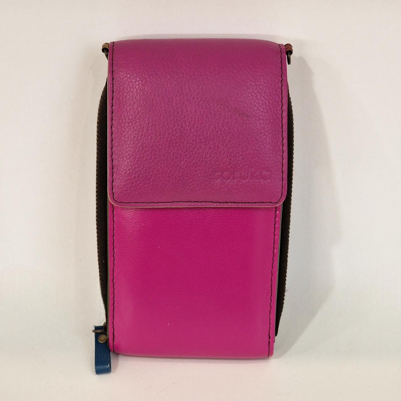 • Bolsa pequena em pele rosa com fecho de aba e fecho de correr lateral azul