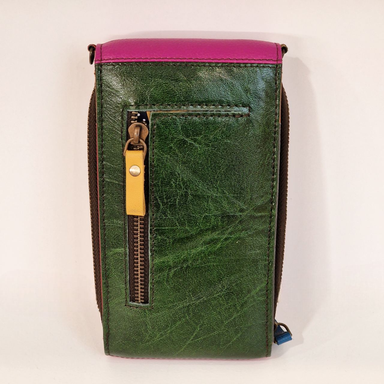 • Carteira ou bolsa verde com detalhe vermelho e fecho amarelo em fundo branco
