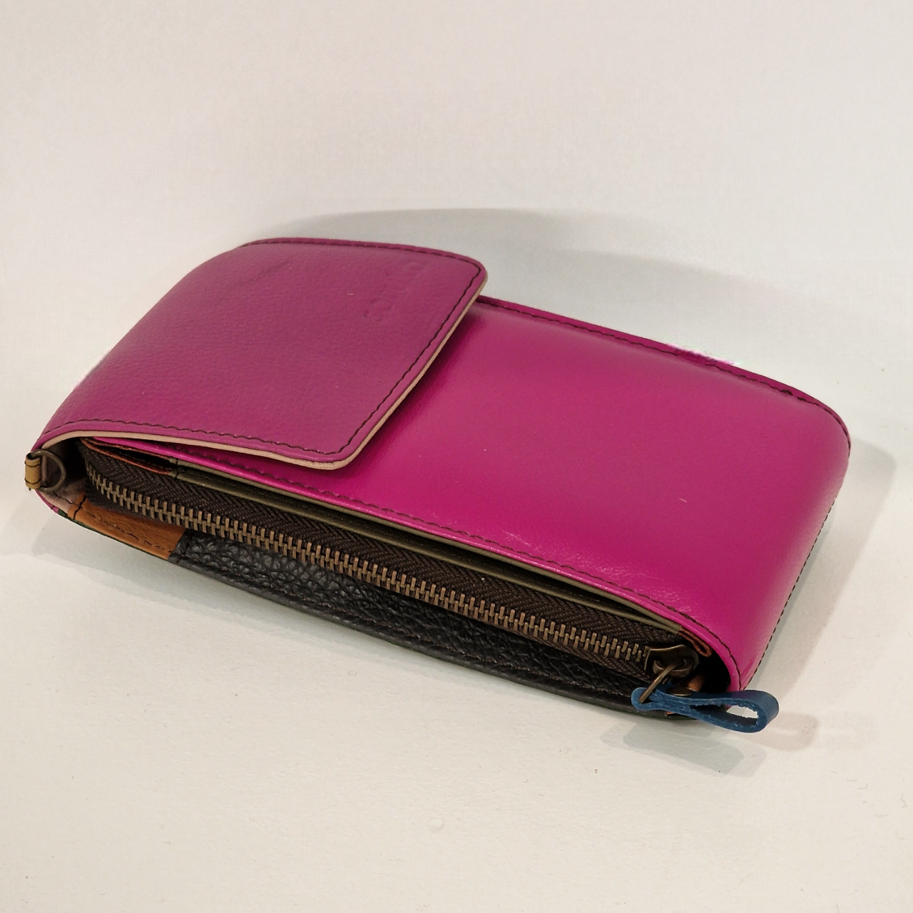 • Carteira de couro rosa e preto com fecho de correr