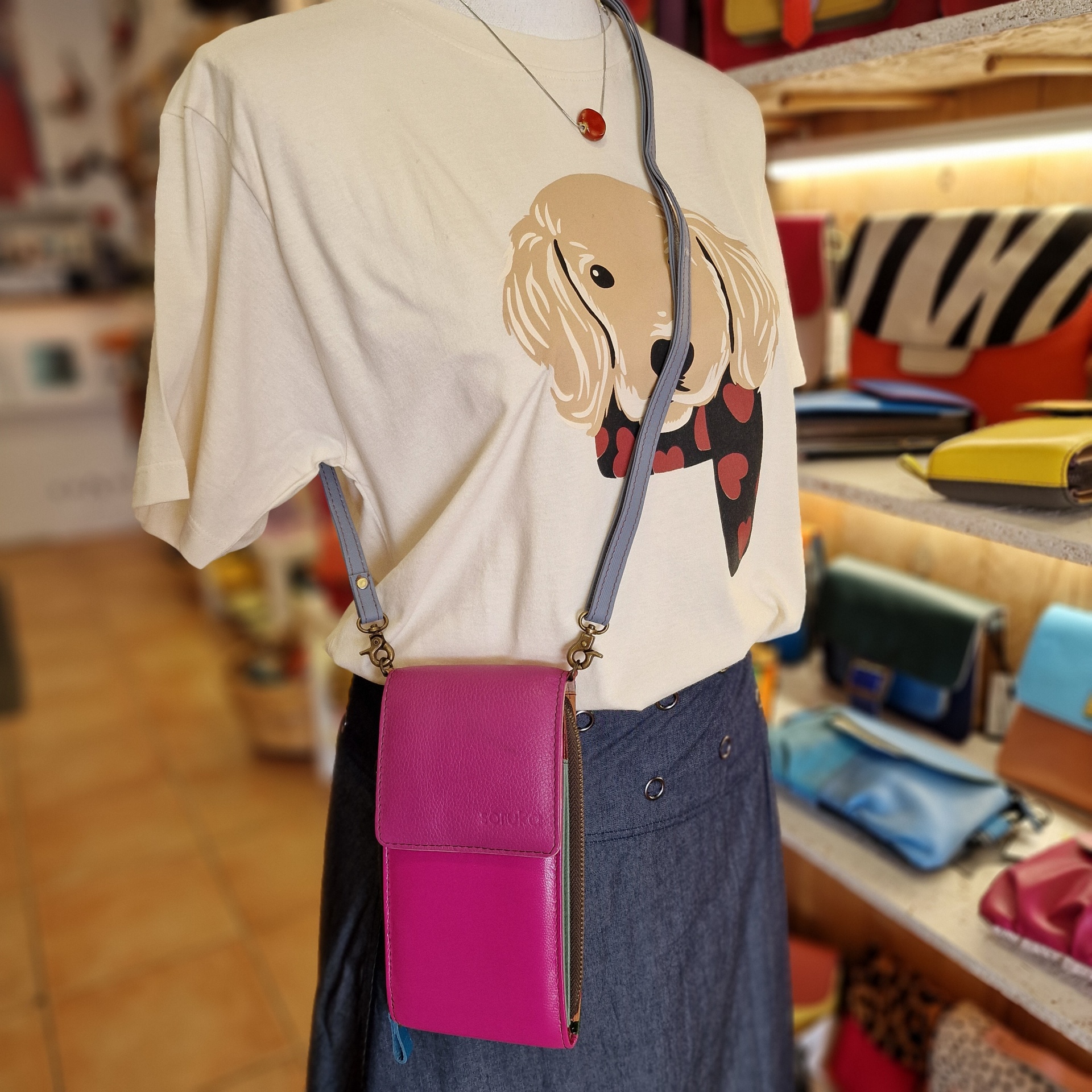 • Manequim com t-shirt de cão e bolsa rosa em loja de acessórios