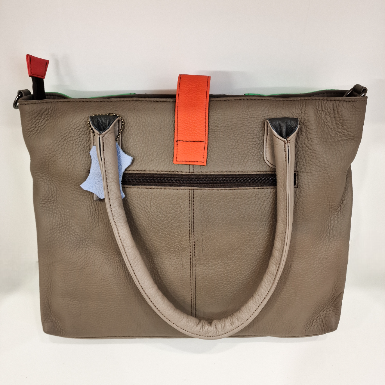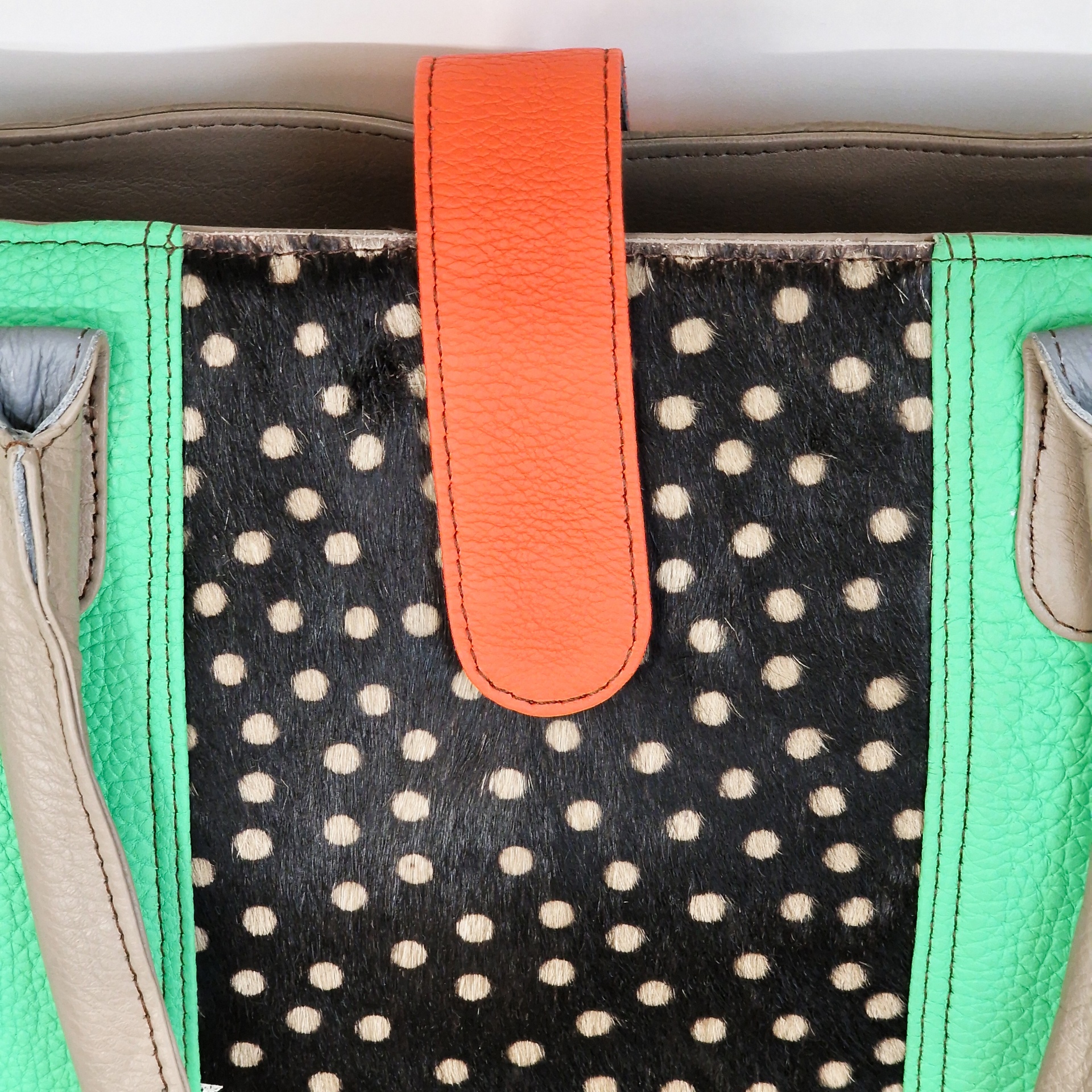 • Mala de mão verde com painel central preto de bolinhas, alças castanhas e fecho laranja