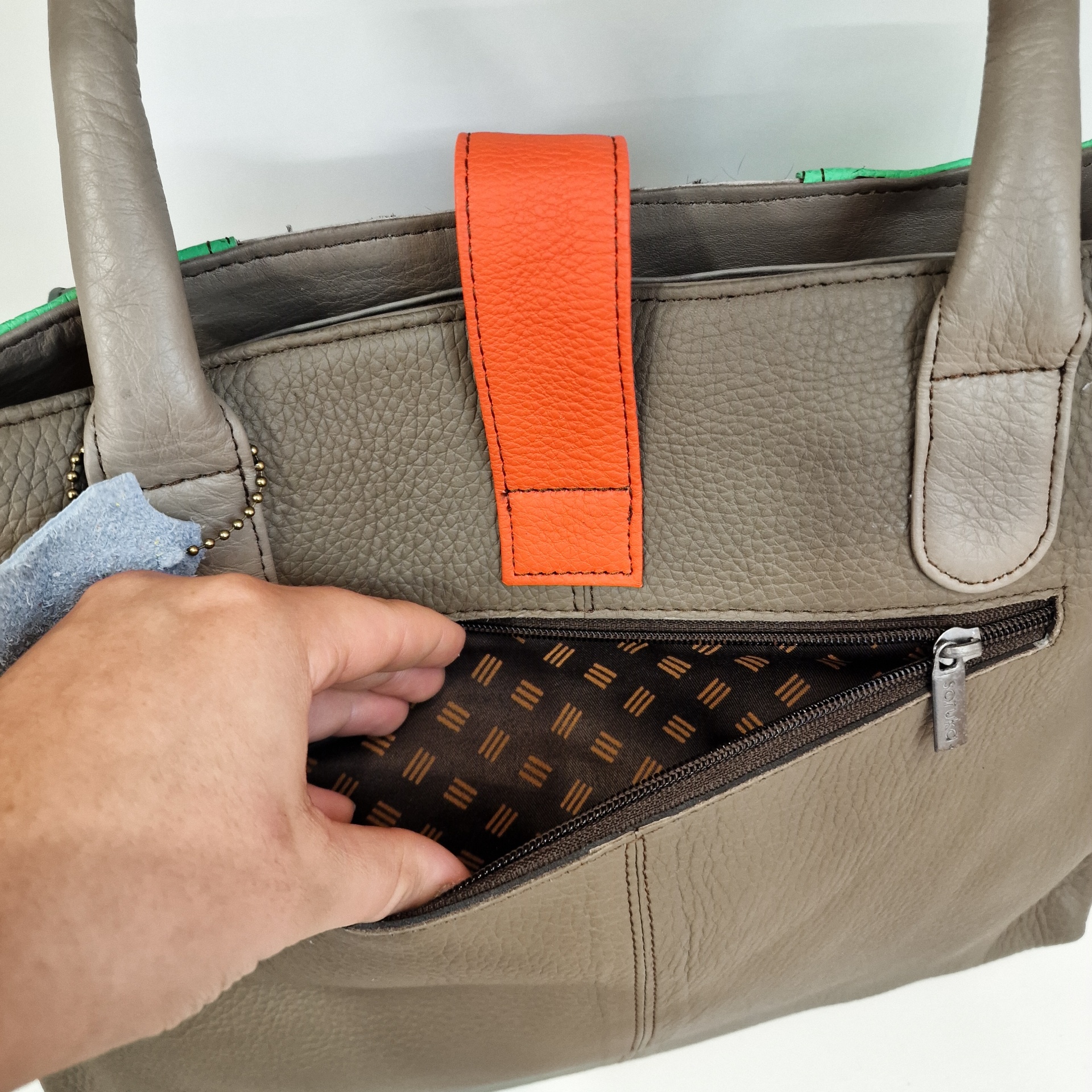• Mala bege de pele com fecho exterior e detalhe laranja