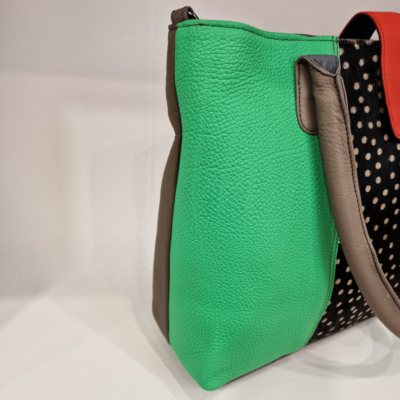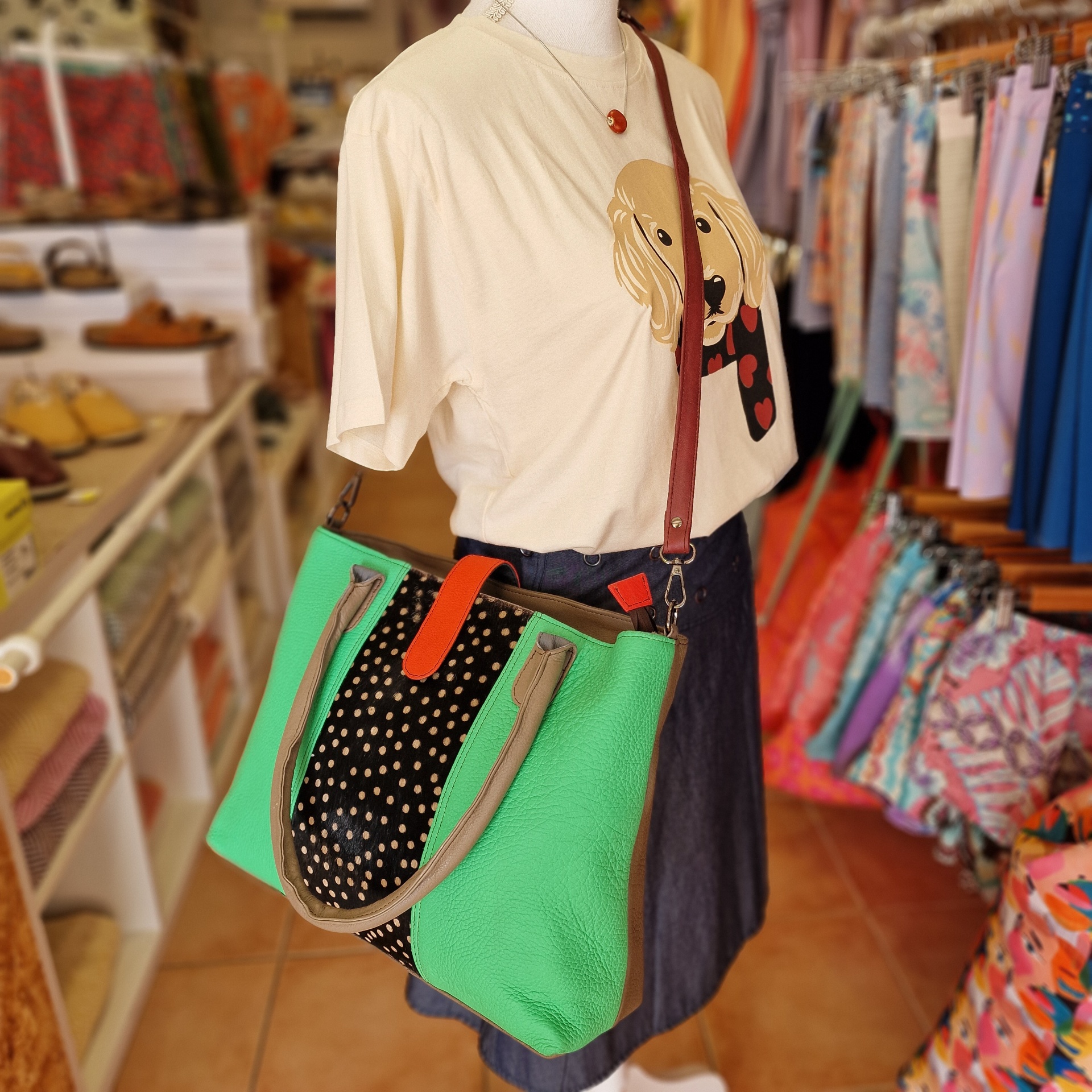 • Mala de senhora verde e preta com bolinhas e alças castanhas exposta num manequim com t-shirt e saia na loja