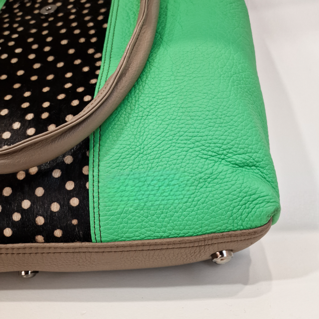 • Detalhe de uma mala de pele verde e preta com pontos brancos