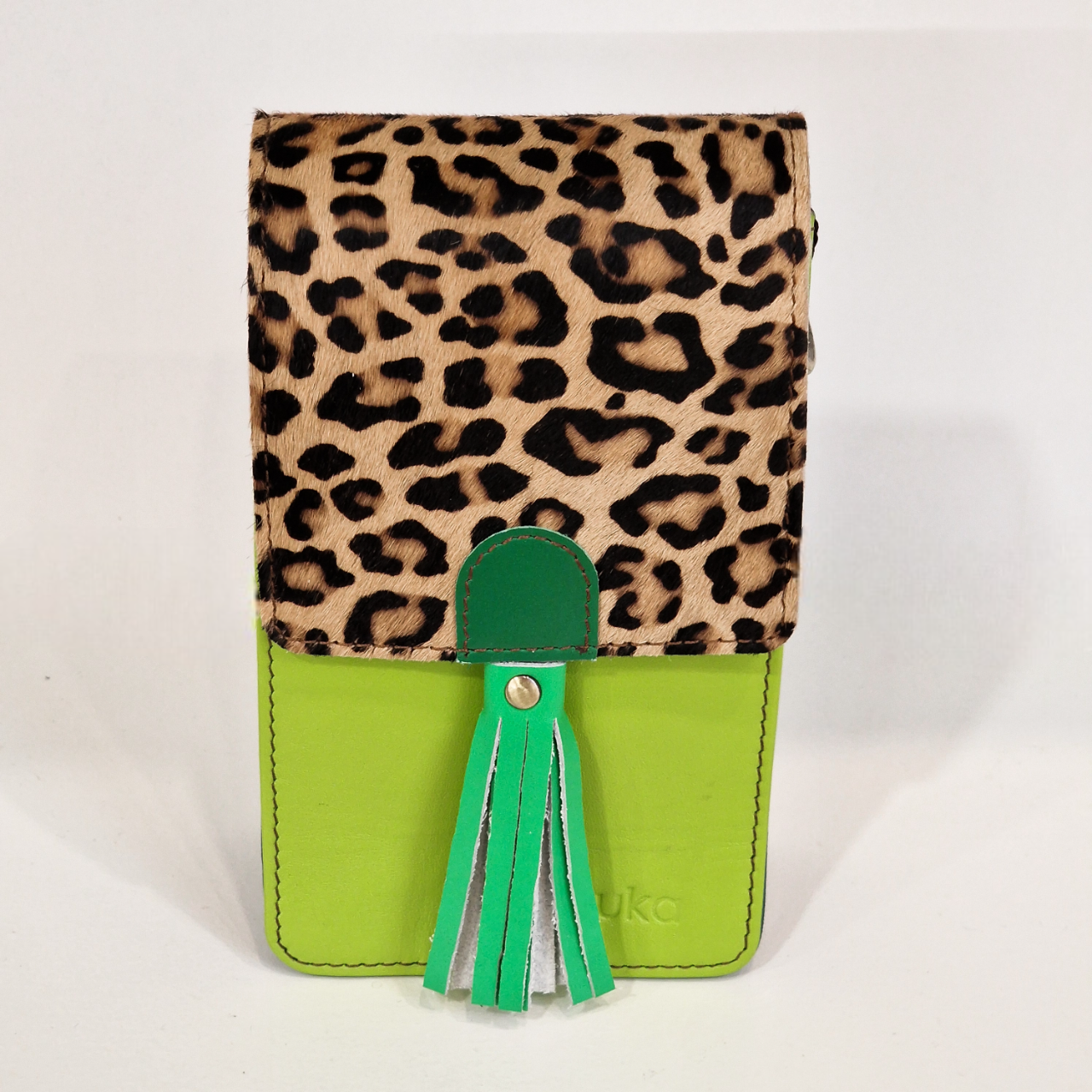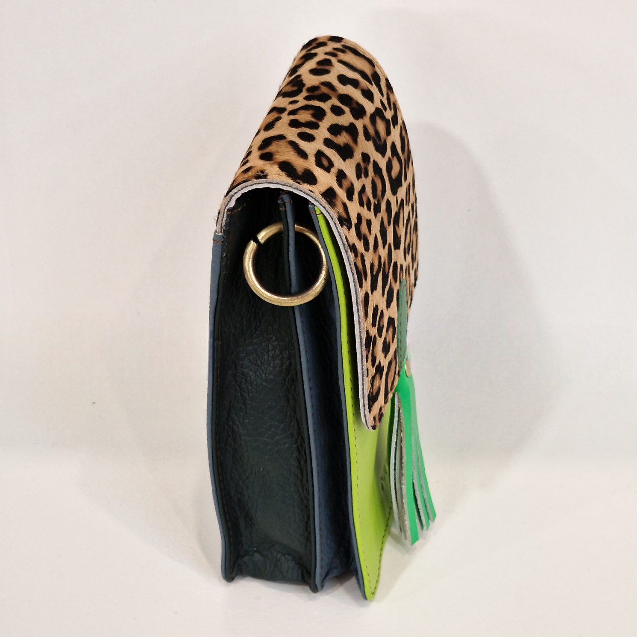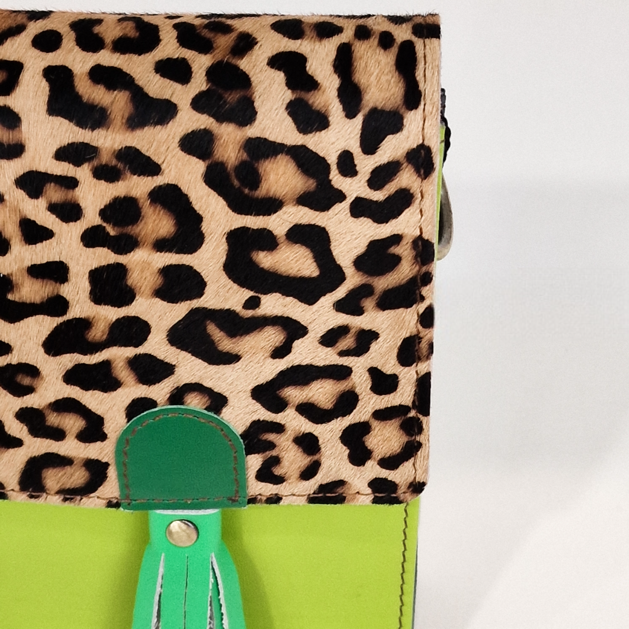 Mala pequena de couro verde com aba em padrão animal print e tassel verde
