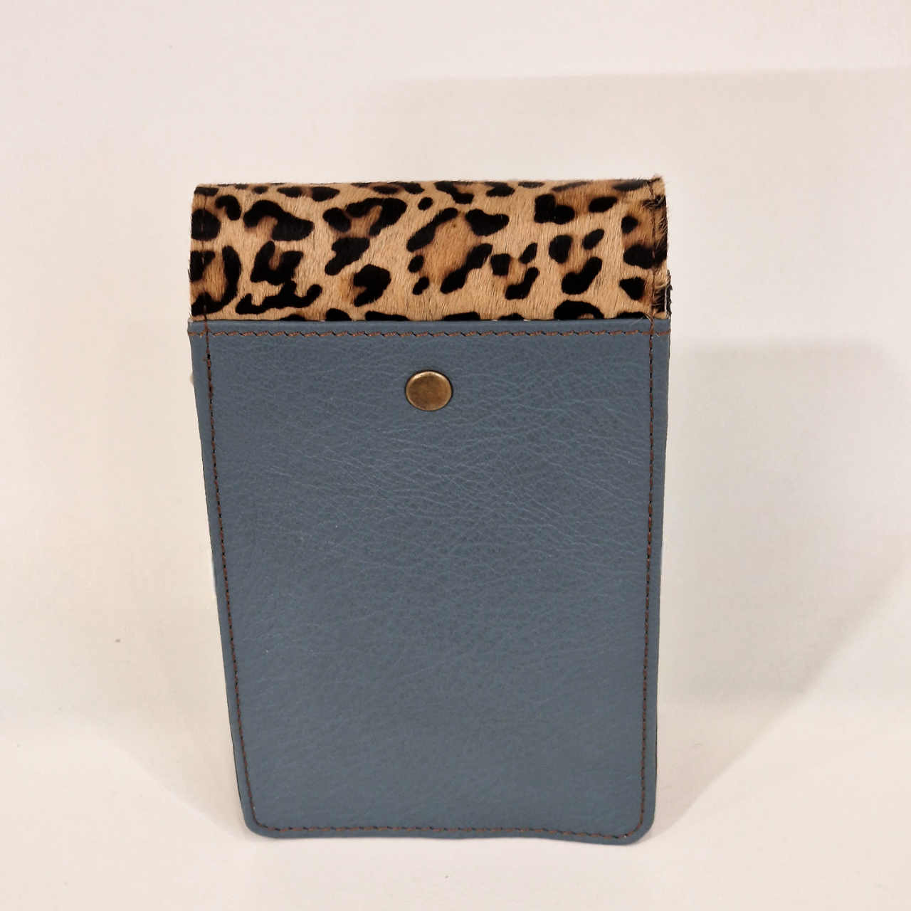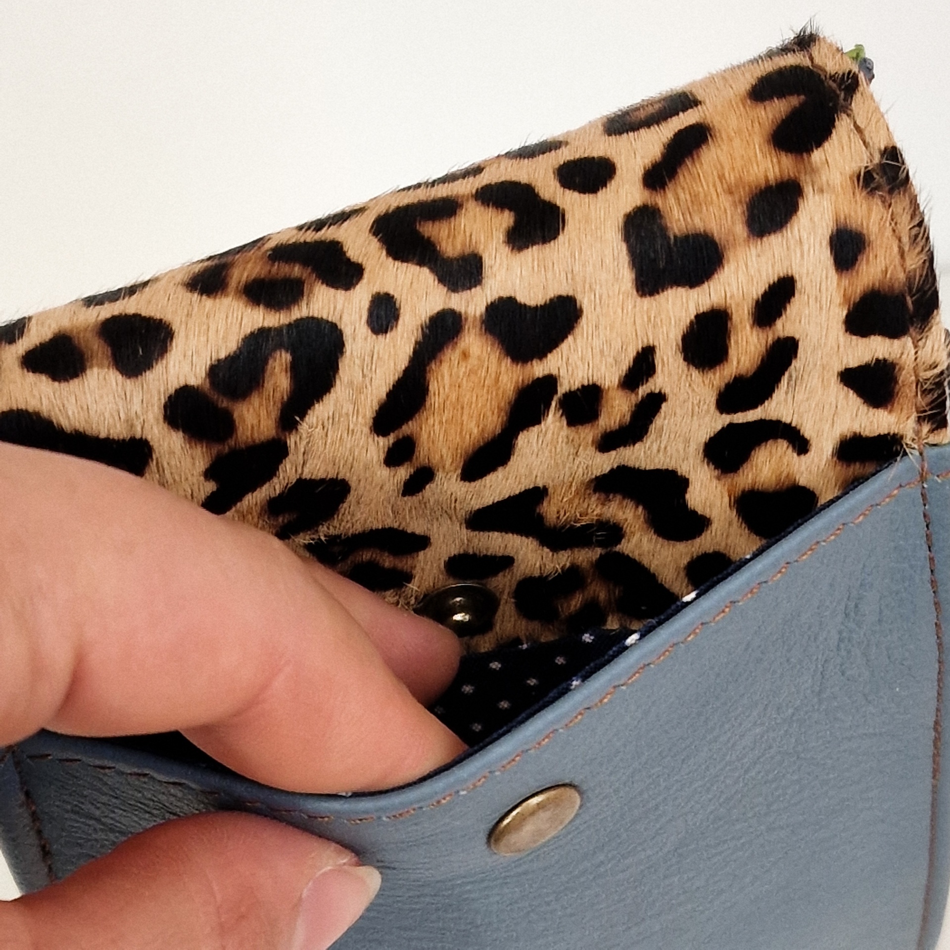 • Carteira azul com acabamento em tecido estampado leopardo