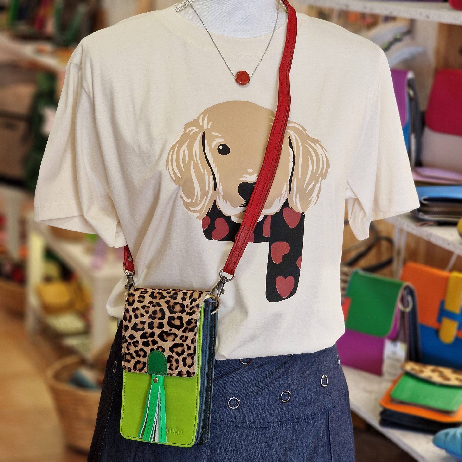 • T-shirt creme com estampa de cachorro, mala tiracolo animal print e verde, saia azul com ilhóses prateados