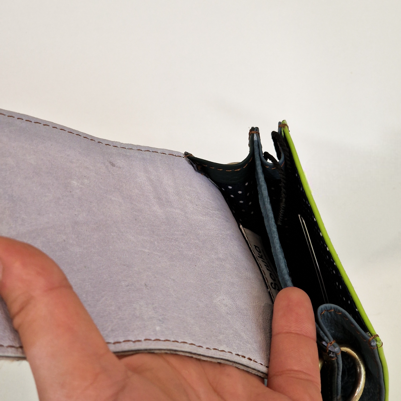 • Carteira aberta com interior cinzento e exterior amarelo neon e azul