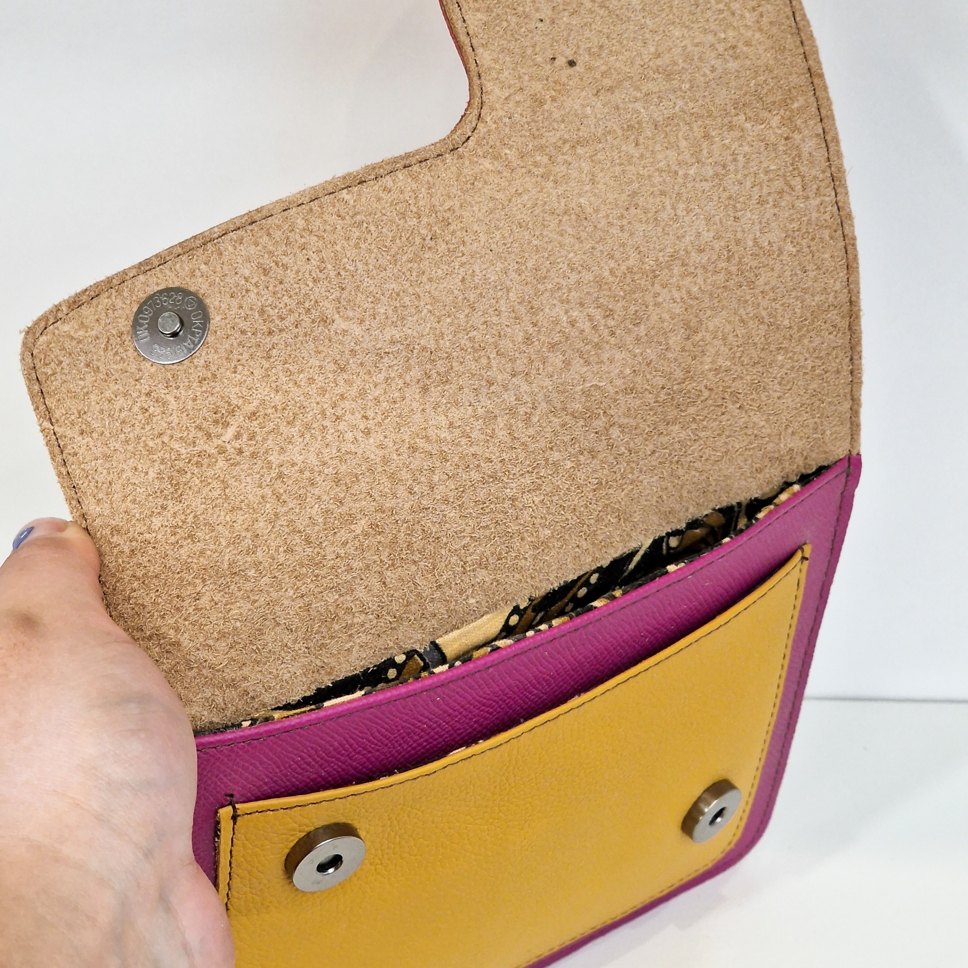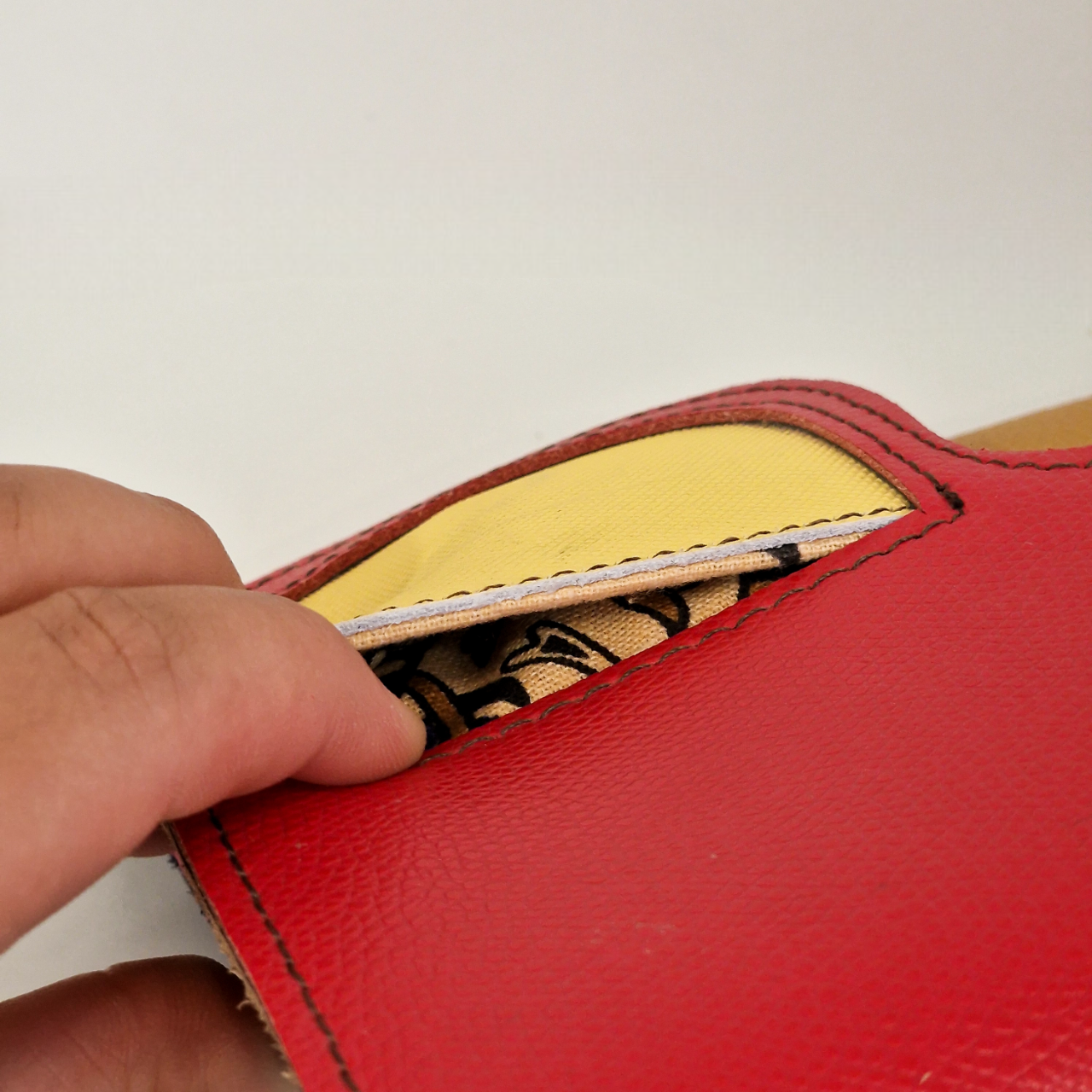• Bolsa em couro vermelho com interior amarelo e padrão preto numa superfície branca