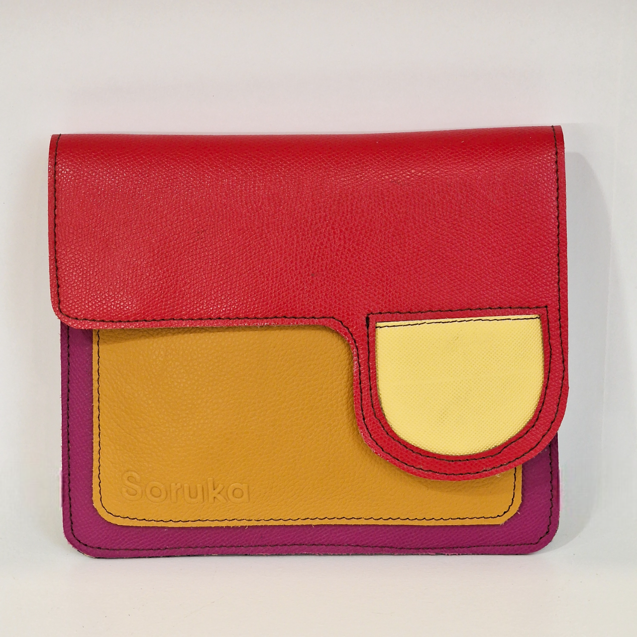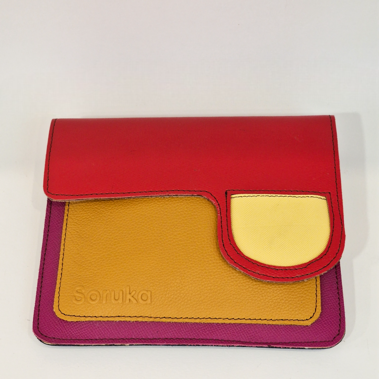 • Carteira de couro tricolor com o nome 'Soruka' em relevo