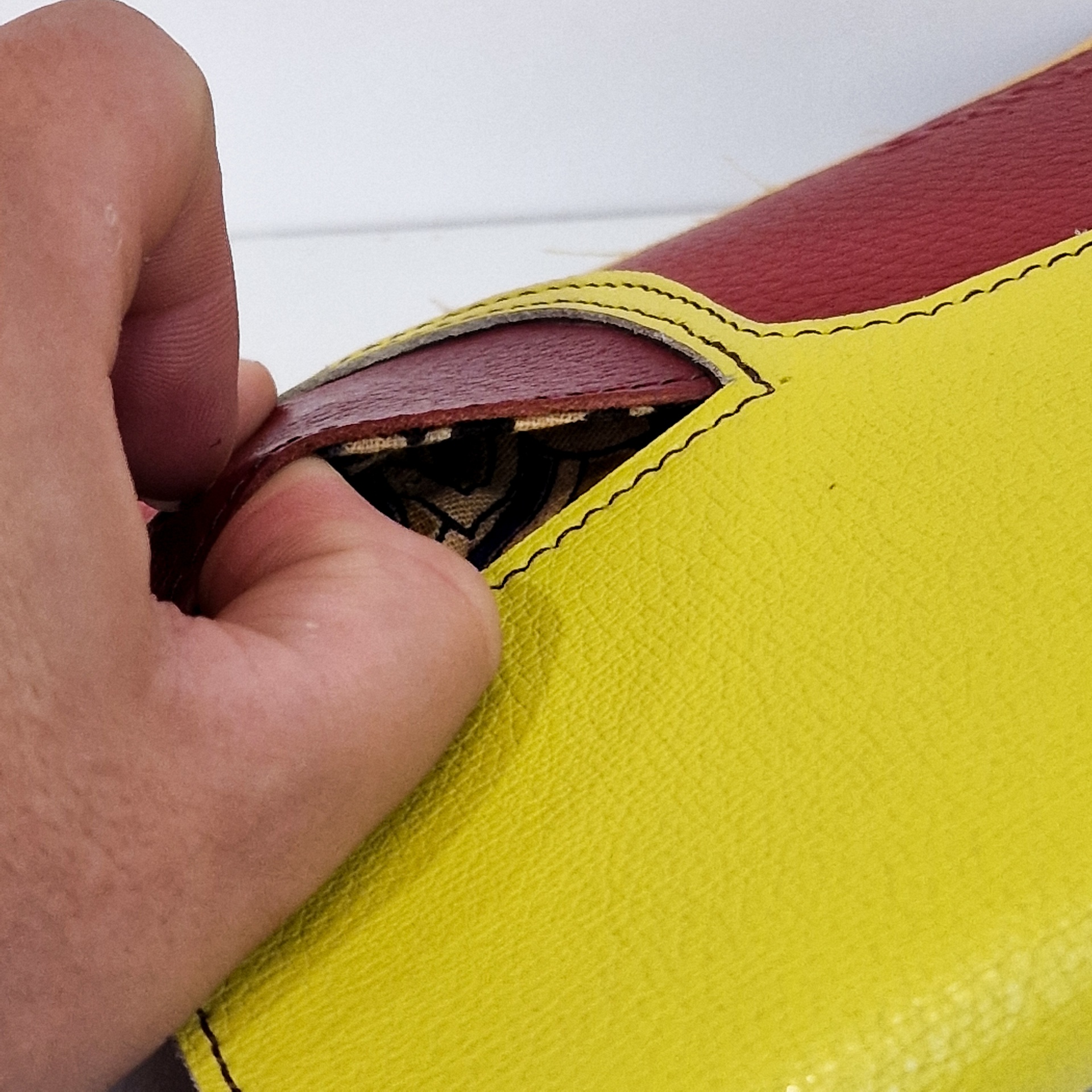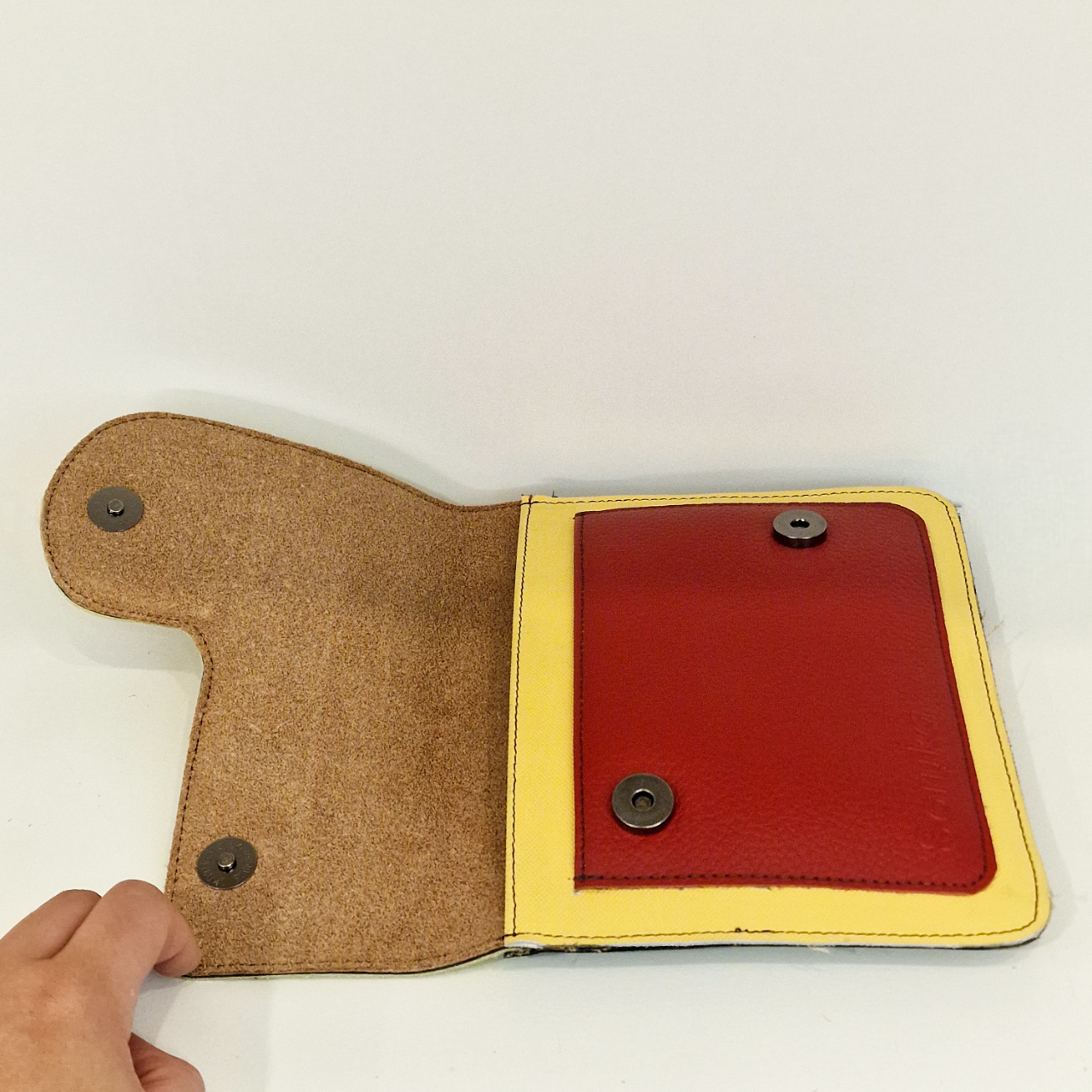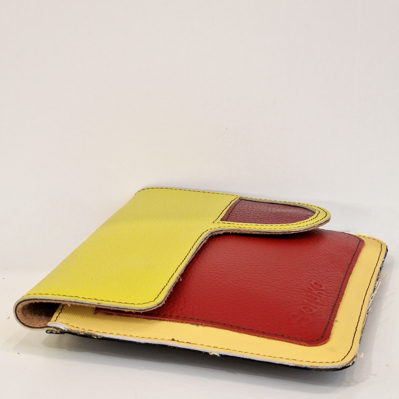 • Carteira aberta em pele vermelha e amarelo com interior castanho