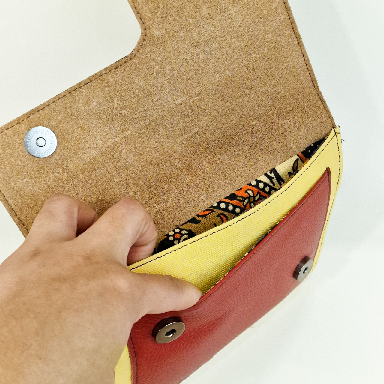 • Carteira de couro amarelo e vermelho com interior castanho e padrão colorido