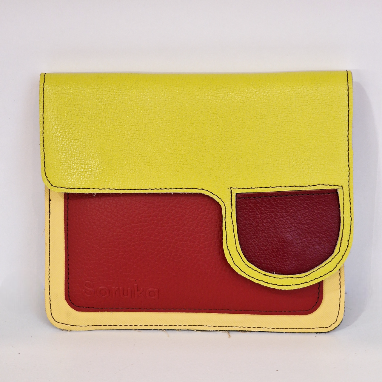 • Carteira de couro amarelo, vermelho e bege com textura granulada e texto Sonuka