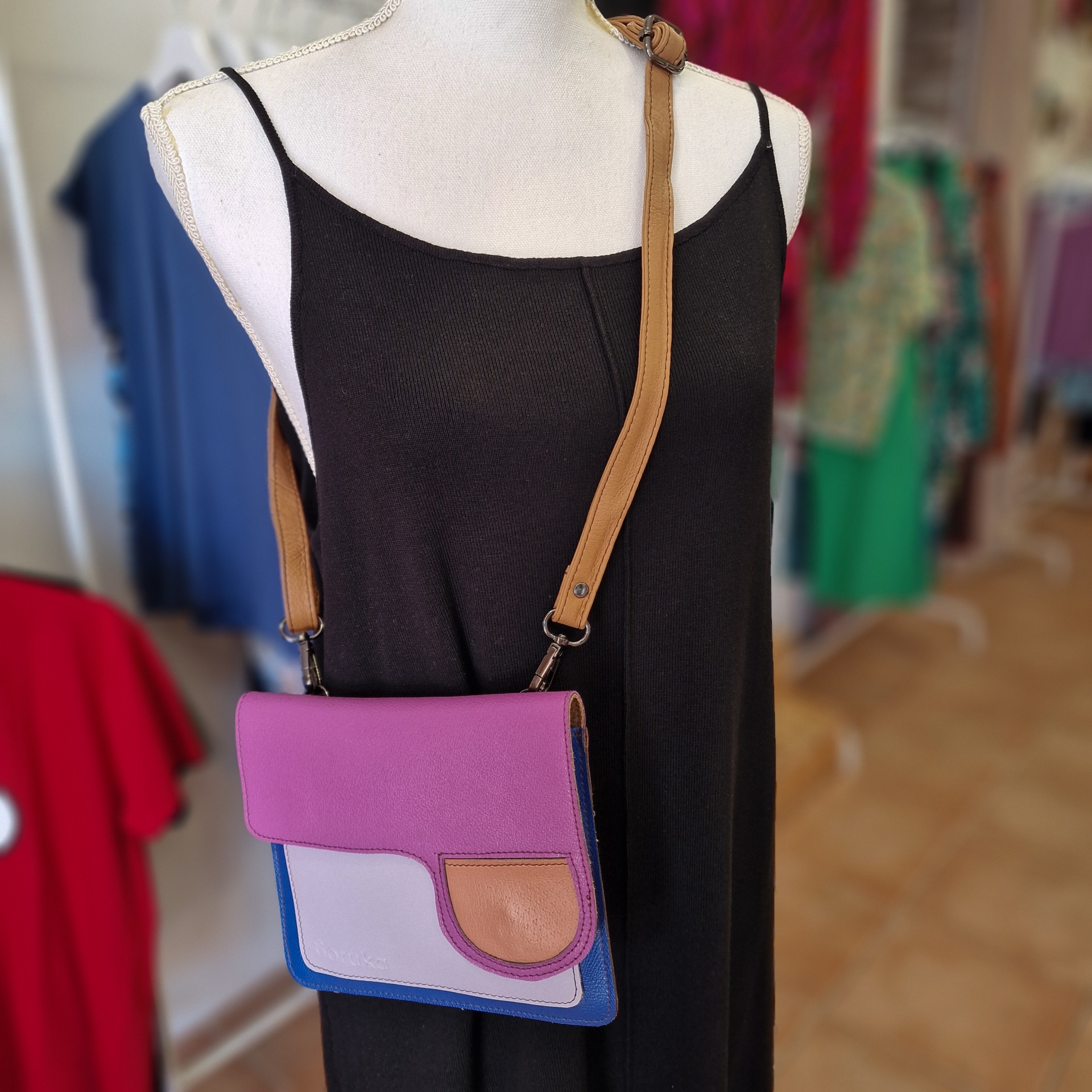 • Mala de ombro colorida com vestido preto num manequim