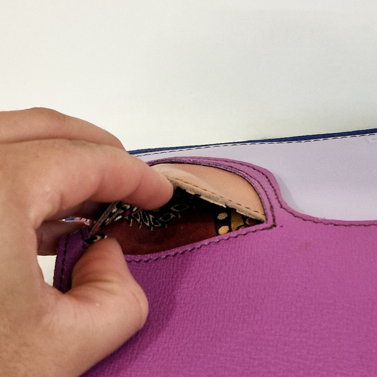 • Bolso em tecido lilás com interior de couro cor creme e mão a abrir o bolso