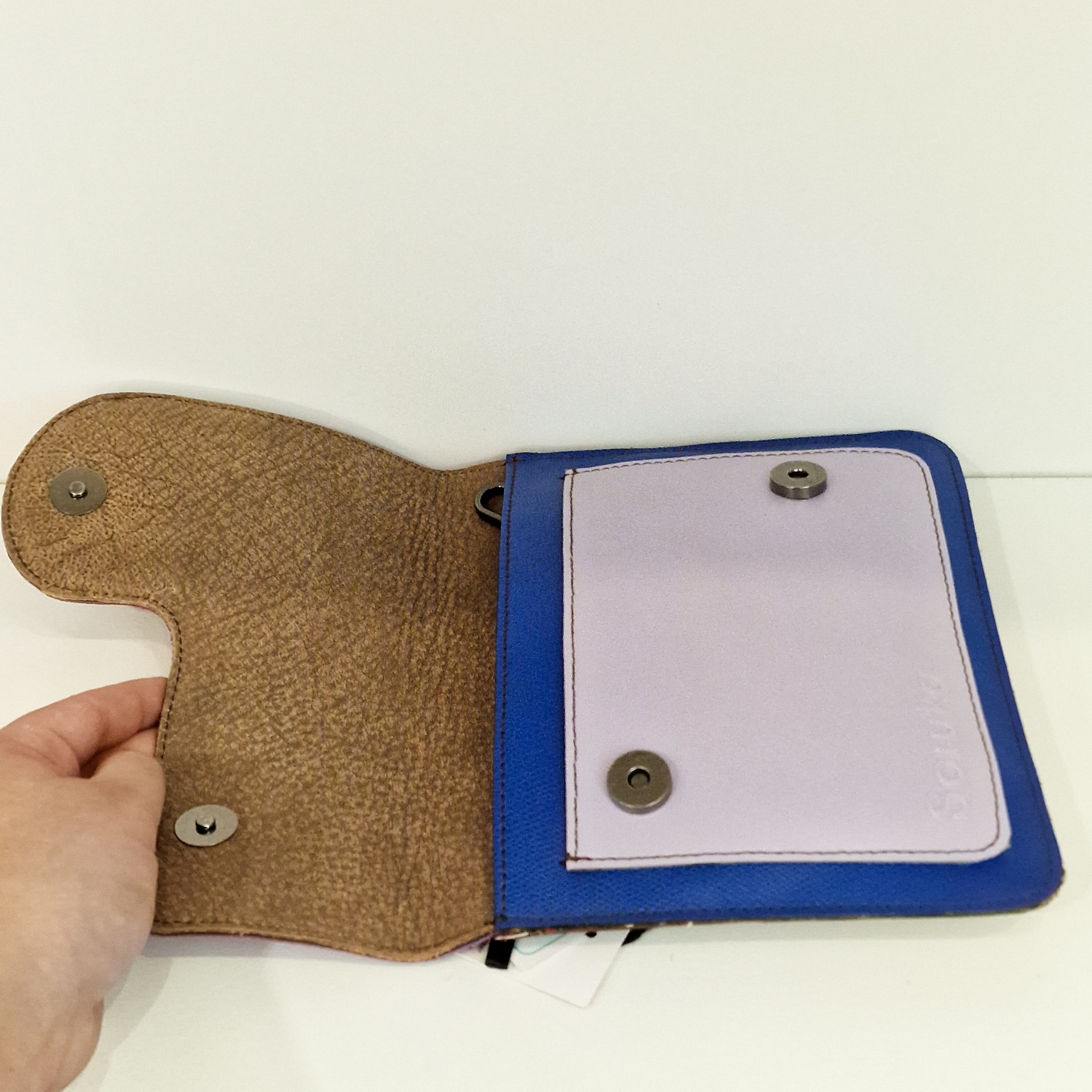 • Carteira azul e bege aberta com fechos magnéticos