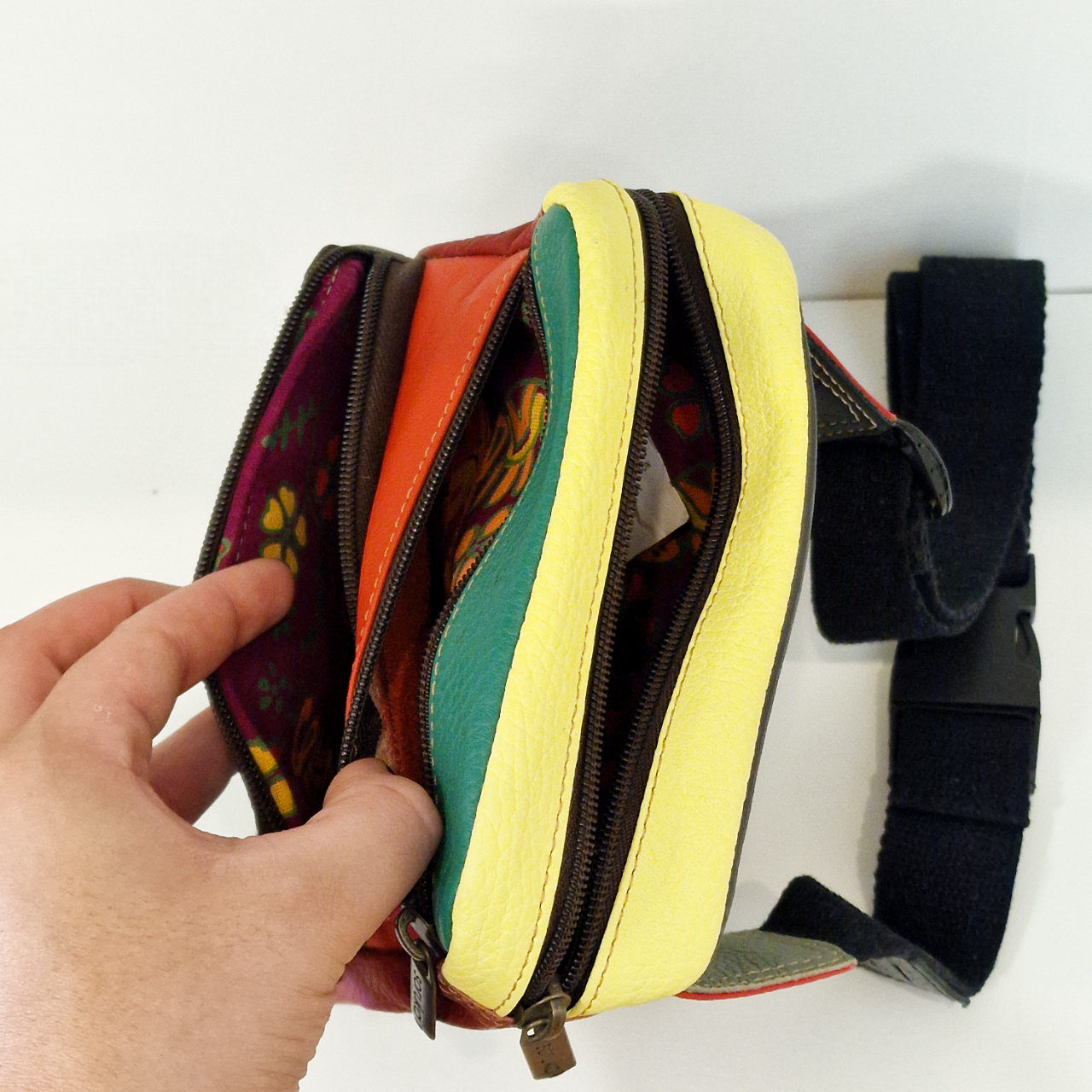 • Bolsa colorida em pele com vários compartimentos e zíperes.
