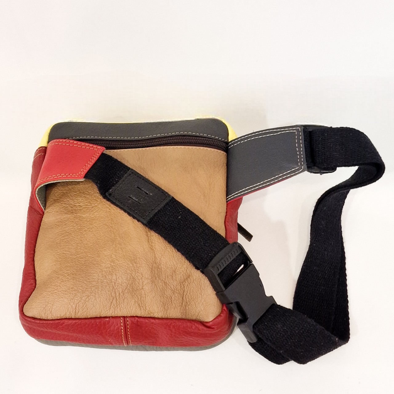 • Bolsa colorida em tecido e couro sintético com três compartimentos e cinta preta ajustável